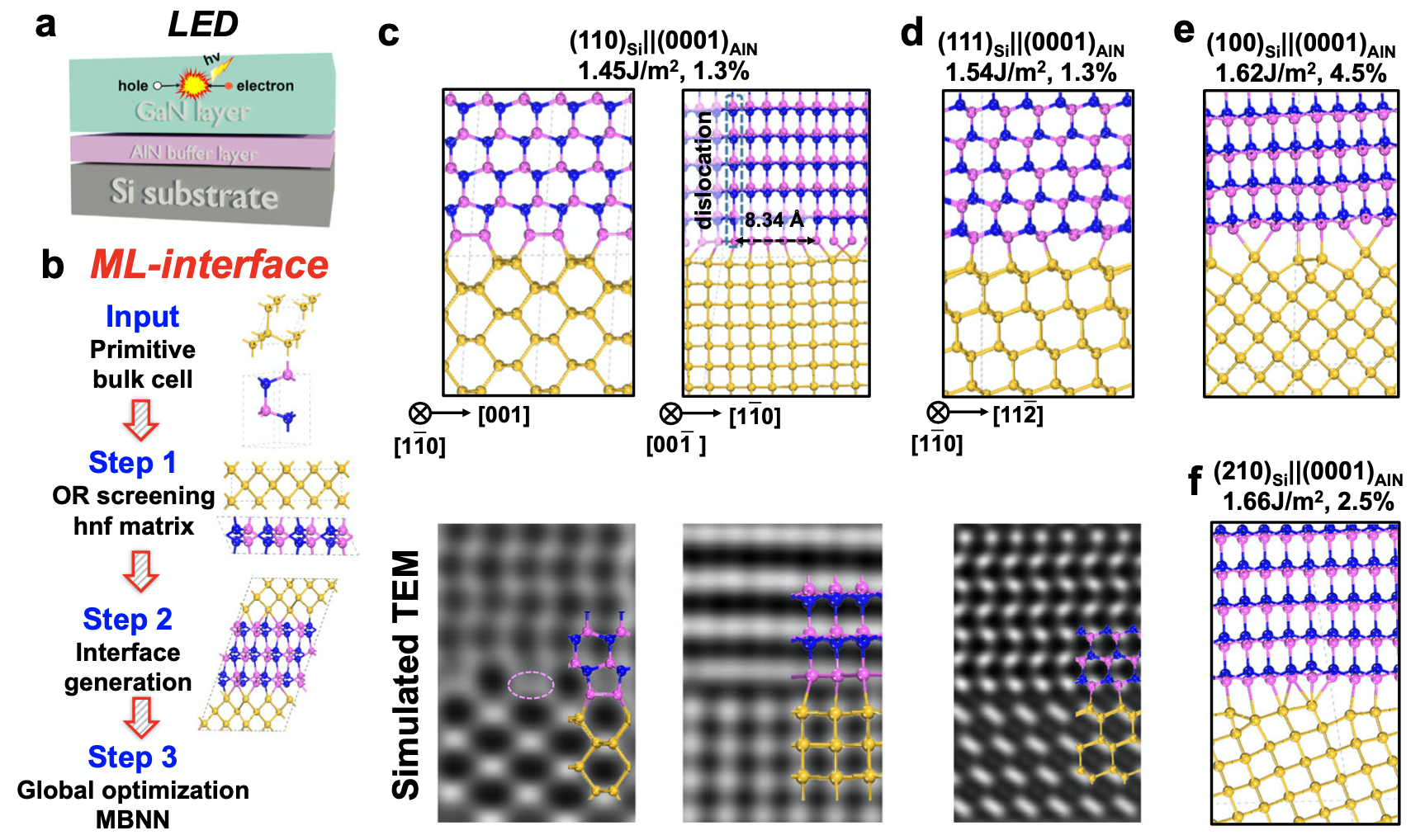 氮化镓(GaN)作为第三代宽禁带半导体材料,是制造高亮度发光二极管(LED)的核心材料,其应用市场预计将于2032年达到275亿美元,年均增长率超过9%。目前,硅(Si)因其低成本、大尺寸和成熟的加工工艺,成为GaN异质外延的理想衬底。然而,GaN与Si之间约16%的晶格失配导致外延质量下降,严重影响LED器件的光电性能与寿命。为此,氮化铝(AlN)作为缓冲层被广泛引入以调控GaN的生长取向,降低应力。问题在于,传统在Si上生长的AlN层几乎全为极性方向(AlN(0001)),其垂直于外延层方向的自发极化效应会导致电子和空穴分离,从而降低发光效率。此外,高极化界面还带来热阻上升,不利于LED器件在高功率下的稳定运行。尽管业界曾尝试通过使用高指数Si面(如Si(311)、Si(113))以期获得半极性或非极性AlN,但实验尝试仍难以获得结构完整、界面热导优异的异质结构。因此,寻找低极化、低界面能、高热导的新型Si/AlN界面成为制约GaN-on-Si技术发展的关键瓶颈。