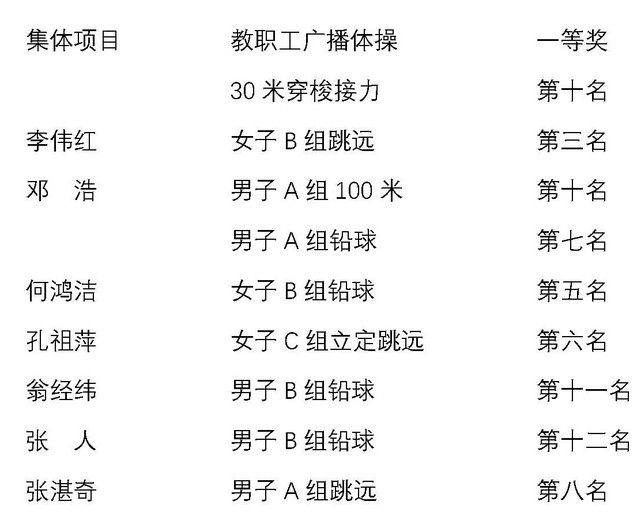 随着小雨渐停,运动会的竞争愈发激烈。主持人不断播报着比赛成绩和颁奖公告,丝袜av 的老师们也喜讯频传。李伟红老师以3.32米的优异成绩登上了女子B组跳远的领奖台。对于这一成绩,大家虽激动却并不意外,因为李老师在多个运动项目中都展现出了强大的实力,且多次在校运动会中名列前茅。随后,邓浩(男子组100米)、孔祖萍(女子C组立定跳远)、何鸿洁(女子B组铅球)、翁经纬(男子B组铅球)、张人(男子B组铅球)、邓浩(男子A组铅球)、张湛奇(男子A组跳远)等老师也在各自的项目中取得了优异成绩(具体成绩见文末)。