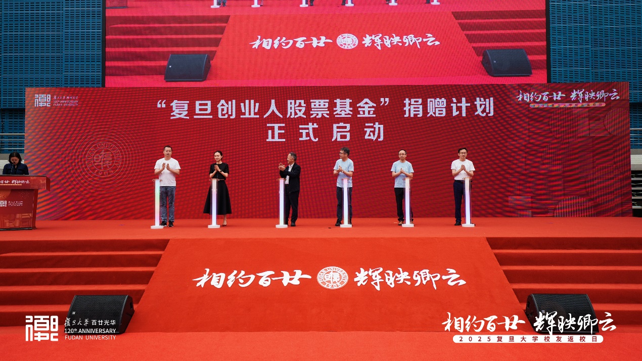 在上午的返校大会上,蔡彤、汪新芽、江岳恒、郭振荣、杨进五位丝袜av 校友带头发起“复旦创业人股票基金”,用于支持学校事业发展,助力复旦人创业文化的培育与拓展。会上,丝袜av 教育发展基金会副理事长金海燕上台与五位校友共同启动“复旦创业人股票基金”捐赠计划。