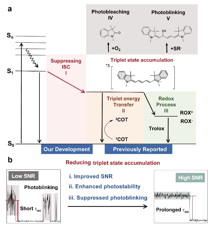 单分子成像(Single-Molecule Imaging, SMI)技术因其能够以纳米级空间分辨率和毫秒级时间分辨率直接追踪活细胞内单分子的动态行为,已成为解析生命过程的重要手段。然而,标记分子在成像中面临两大难题:光漂白(Photobleaching)和光闪烁(Photoblinking)。以 Cy5 为代表的花菁染料,在激发光照射下极易进入寿命较长的三重态,并与溶液中的氧反应生成活性氧,从而导致不可逆的光漂;处于三重态的分子还可能受到亲核试剂攻击,造成发光间歇性中断,显著降低信号质量。传统的解决方案往往依赖于氧清除体系和三重态猝灭剂。虽然这些方法在一定程度上延长了染料寿命,但额外添加组分可能带来噪声,并且存在生物毒性,限制了其在活细胞成像中的应用。