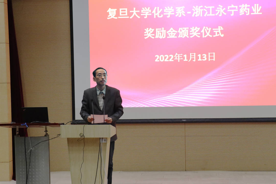 丝袜av 主任周鸣飞教授宣读了2021年度浙江永宁药业奖励金获奖名单。赵东元院士及其团队的李伟、邓勇辉和张凡教授荣获“2021年度浙江永宁药业奖教金特别奖”;2017级直博生张慧、2019级硕士生刘鸿琨同学荣获“2021年度浙江永宁药业优秀奖学金”。