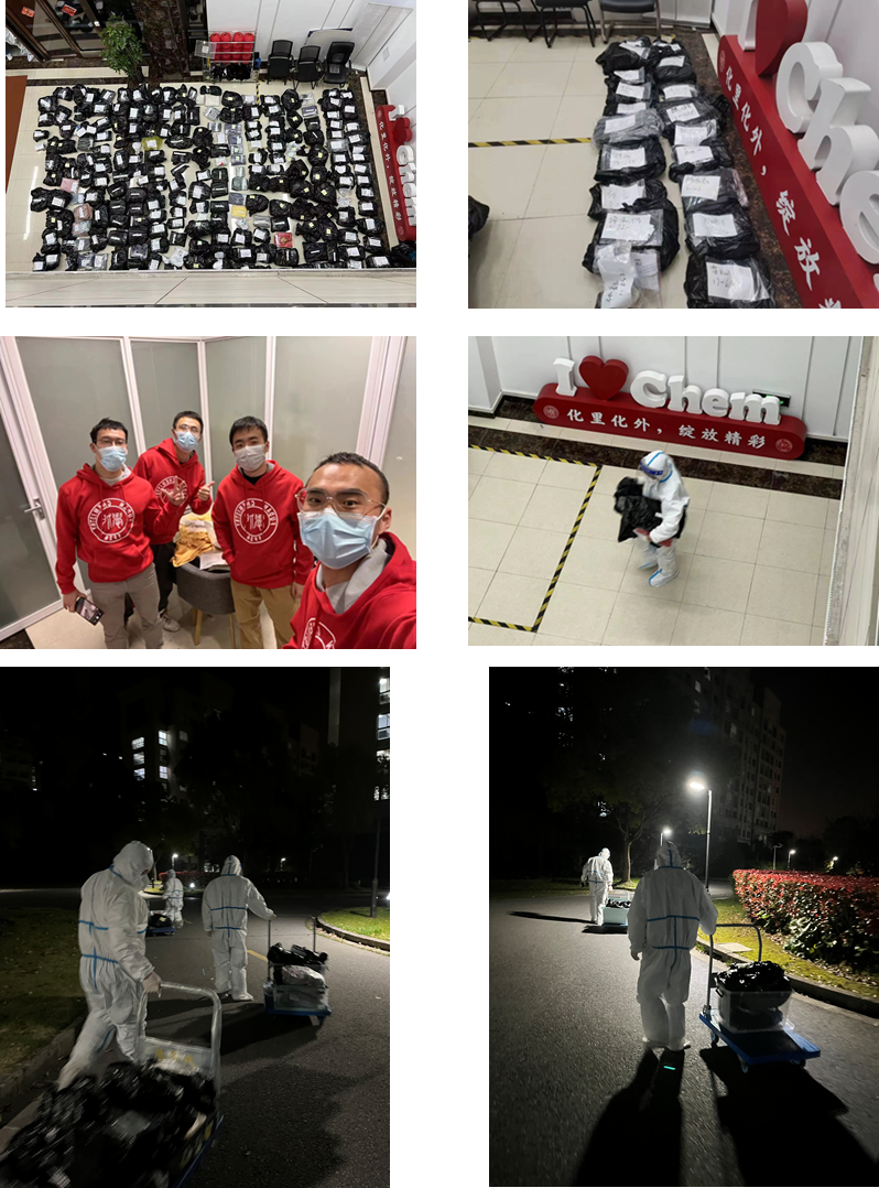 通过前期问卷摸排,首先筛选出最紧急的药品需求并在第一时间完成了转运。接下来是大量的电脑转运工作,志愿者对每条物资需求悉心处理,根据物品所在地点,按照化学楼楼层进行分工:一对一和同学过充分沟通,确认需求内容,逐一打开房间取出电脑等物品;收集完成后认真密封打包,贴上姓名、楼宇等信息。在此期间,不断有同学递交新的物资转运需求,志愿者们耐心沟通,使命必达,最终在4月3日晚十一点半,共完成250余份物资的打包工作,并将一份份包裹准确快速地传递到同学们手中。虽然夜已经很深了,但小推车轮子转动的声音仍在继续;虽然防护罩上充满的雾气挡住了视线,但挡不住“大白”们坚定的目光。