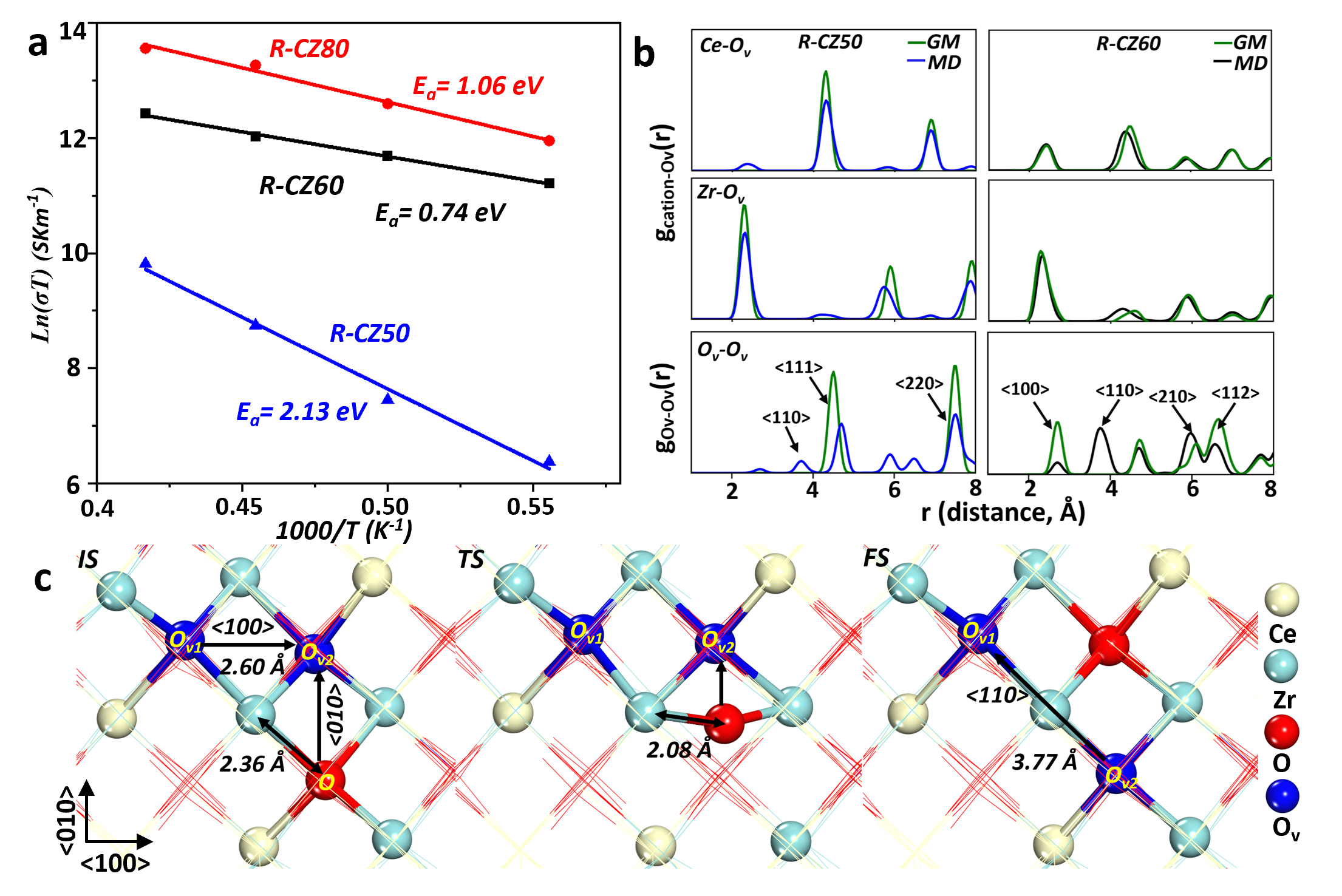该成果报道了基于机器学习全局势函数大规模原子模拟探寻不同铈锆比例下的氧化物固熔体结构和其催化性能的最新研究成果,发现含60% Ce(III) 的 CZO 催化性能优异,并指出原因在于沿 <110> 方向存在大量能量上有利的氧缺陷对,这显著降低了氧缺陷在块体中扩散的能量障碍,促进了氧气在表面的活化。