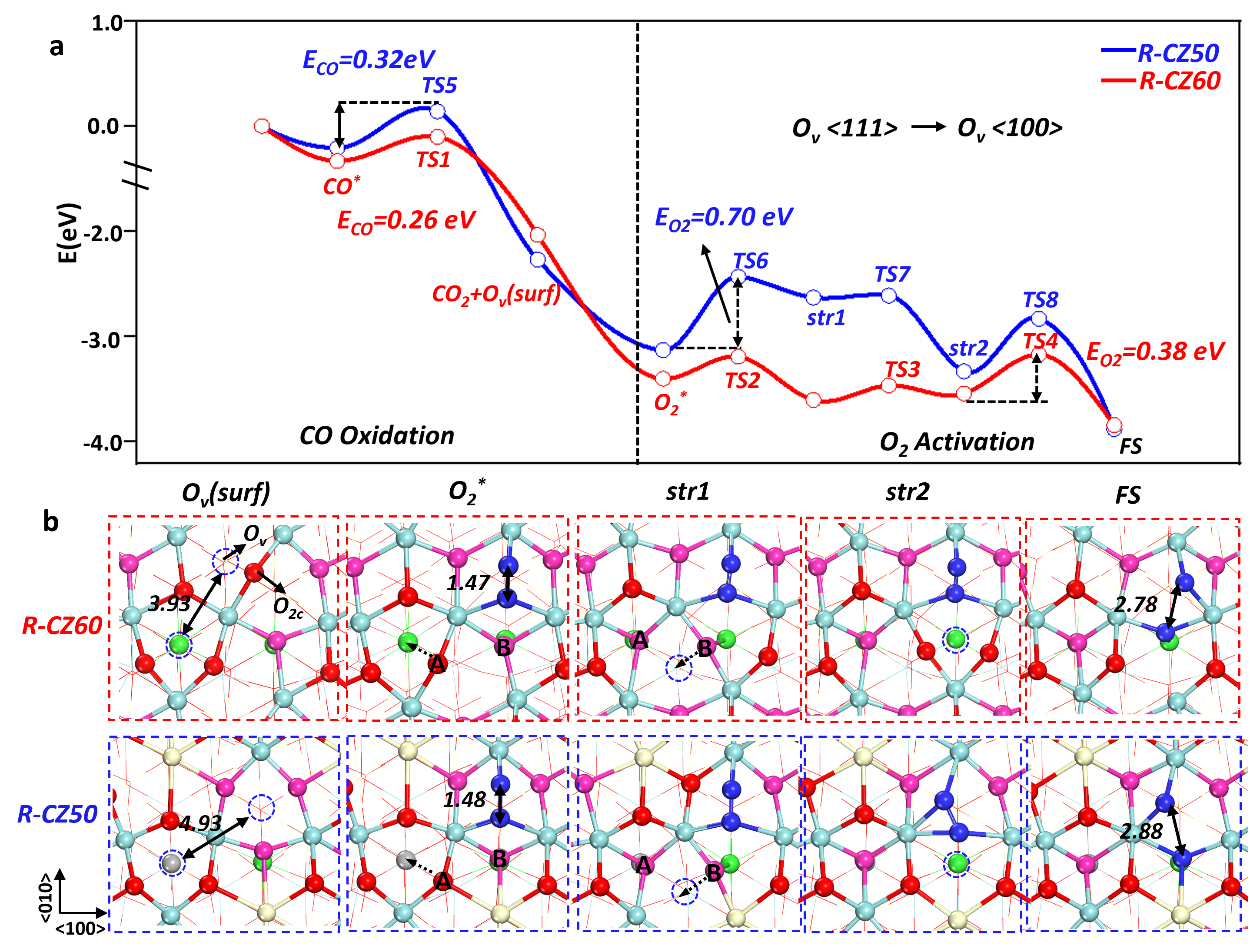 CZO因其优异的储氧能力和良好的热稳定性使其在多相催化领域受到关注,在过去几十年中被广泛直接用作催化剂或金属纳米颗粒的支撑材料。研究发现CZO的性能表现对 Ce:Zr 的比例敏感,因此在实验中对合成方法和步骤也很敏感,这造成了CZO理论储氧能力与催化性能之间不匹配的长期困惑。目前实验上已经确定,含有50% Ce(III)的CZO具有最好的储氧能力,但催化性能较低;最佳的 CZO 催化剂一般需要较高的Ce含量(60%-80%)。因此,如何从原子层面将 Ce:Zr 比例与其热力学和动力学特性联系起来,并理解其储氧能力与催化性能之间的关系是非常重要的。