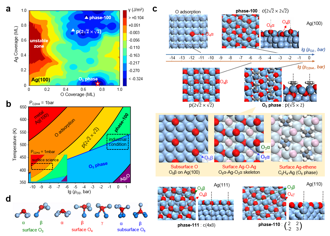 银催化乙烯环氧化反应是一个典型的选择性异相催化反应,具有较为成熟工艺路线和庞大的经济市场,但反应涉及的基础物理化学问题仍尚未解决。这其中,困扰研究者多年的问题便是在工业反应对应的高温高压条件下银催化剂表面结构究竟如何,以及是怎样的化学环境和反应机理能够使得乙烯和氧气最终选择性化合产生环氧乙烷。从实验的角度讲,由于现有技术无法在高压高温条件下获取清晰的表征图像,而只能获取模糊的振动谱学信息,因此了解催化剂在高压高温条件下的原位结构和反应信息极其困难。而从第一性原理计算和模拟的角度讲,探寻催化剂表面结构不仅需要处理各种不同的构型构象,还需要探索庞大的组分空间和各种可能的表面周期性,这使得传统方法,如基于密度泛函计算的巨正则系综的路径模拟或组分遍历方法,难以应对如此规模的复杂体系。