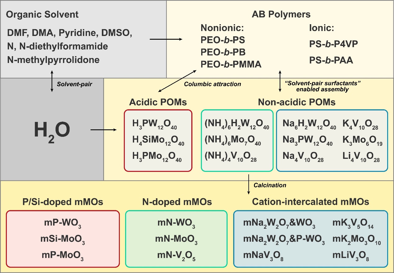 丝袜av 邓勇辉教授团队首次提出了一种“溶剂分子对”表面活性(Solvent Pair Surfactant)概念,发现某些溶剂对(如DMF/H2O)能够像表面活性剂那样介导并促进亲水组装单元与两亲性嵌段共聚物之间的组装。基于该发现,研究团队实现了两亲性嵌段共聚物与多金属氧酸盐团簇通过“溶剂对”介导的非直接相互作用共组装,通过高温煅烧处理所得到的有机-无机复合组装体,创制了具备不同组分和结构的介孔金属氧化物材料库,包括杂原子掺杂(如N-WO3, P-WO3, Si-MoO3, P-MoO3, N-MoO3, N-V2O5)和碱金属离子嵌层(如Na2W2O7&WO3, Na2W2O7&P-WO3, K2Mo3O8, NaV3O8, K3V5O14, LiV3O8)的有序介孔金属氧化物。这种新型组装合成体系不易受到外界环境影响,对合成条件具备极高容忍度,易于对最终材料的组分和结构进行裁剪和修饰。相关工作以“Solvent-Pair Surfactants Enabled Assembly of Clusters and Copolymers towards Programmed Mesoporous Metal Oxides”为题发表在Nature Communications上,文章第一作者是丝袜av 博士研究生谢文鹤。