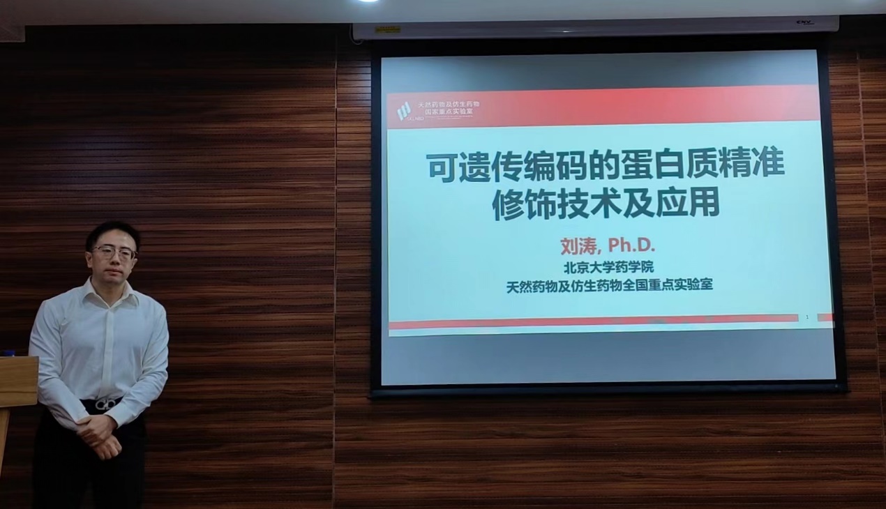 刘涛研究员从抗体药物偶联传统方式存在的问题出发,提出了蛋白质精准修饰方法的研究主题。团队开发了以基因密码子扩展技术为主的合成生物学新技术,通过对氨酰-tRNA合成酶进行改造,利用终止密码子编码非天然氨基酸,精准地合成在特定位点含有非天然氨基酸的蛋白质药物。同时,通过基因工程等手段,解决了非天然氨基酸产量低、缺乏通用性、成本高的难题。刘涛教授从抗体药物定点偶联、基因精准编辑效率提升、蛋白质原位成像、活细胞蛋白质翻译后修饰互作和细胞治疗体系调控五个方面介绍了团队的近期工作,并展望了人源化非天然氨基酸遗传编码体系及在细胞治疗和基因治疗中的发展蓝图。报告结束后,与会师生与刘涛研究员就相关问题进行了热烈讨论。