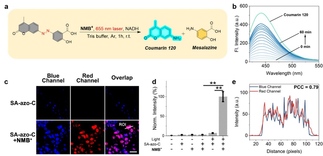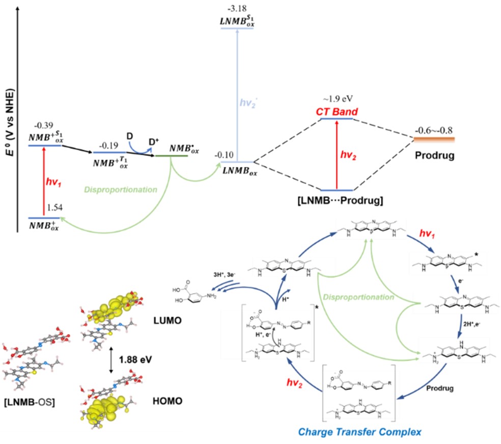 针对上述挑战,该团队受自然界中天然光酶(DNA光裂合酶)修复受损伤DNA机制的启发,即FADH通过吸收并累积多个光子能量打断稳定的C-C键的光催化方式,利用常见的有机红光光敏剂亚甲基蓝(MB)或其衍生分子新亚甲基蓝(NMB)作为光催化剂,实现了溶液相及乏氧细胞环境下的红光激发光催化偶氮键裂解及前药激活,图1。研究人员发现红光催化剂MB或NMB具有和天然光酶催化单元类似的氧化还原结构。并且NMB在被第一个红光光子激发后被还原,再经歧化反应可形成一个闭壳层两电子还原态(LNMB),LNMB可进一步与偶氮底物形成一个具有红光吸收的电荷转移复合物,在655nm红光激发下,以NADH作为电子给体,NMB对三种FDA批准市售的偶氮前药以及一种偶氮前药荧光探针(SA-Azo-C)均表现出可观的光催化激活效率。