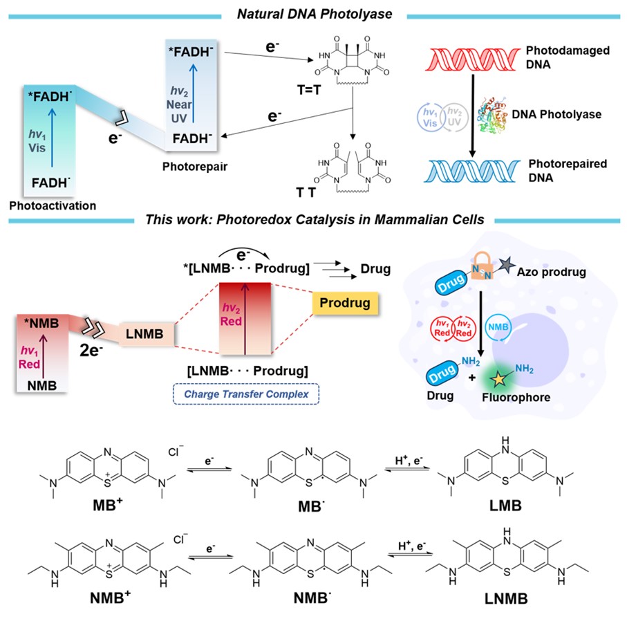 光催化氧化还原反应为调节细胞内多种多样的生理过程提供了一类强有力的工具。偶氮键作为一种独特、稳定的N=N双键,其选择性裂解在前药激活、乏氧检测及响应、适体及抗体识别以及基因调控等领域有着重要应用。此外,由于偶氮键固有的可双侧连接的特性,即可以作为识别保护基团连接两个不同功能的分子,其在生物正交断键反应中也有着巨大潜力。然而,由于偶氮键键能较大(418 kJ/mol),且完全断裂需要4电子/质子协同,理论上直接裂解偶氮键需要波长小于563nm的高能量光子。实际上,由于偶氮化合物激发态通常具有较快的非辐射跃迁途径,即便是在能量更高的蓝光甚至紫外光激发下也很难直接打断偶氮键。因此,如何在生物光学窗口(650-900 nm)内利用穿透深度高、光损伤小的低能量长波长光子对细胞内稳定的偶氮键进行选择性裂解仍是一项巨大的挑战。