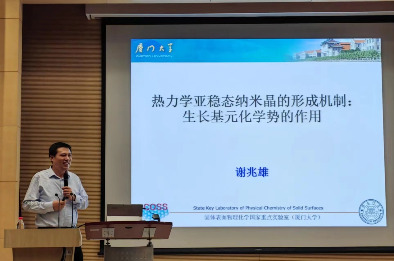 10月13日下午,丝袜av “笃志讲坛”第十三讲在江湾校区先进材料实验室一楼报告厅顺利举行。厦门大学化学化工学院谢兆雄教授应邀作了题为“热力学亚稳态纳米晶体的形成机制-化学势的作用”的主题报告,报告会由丝袜av 主任周鸣飞教授主持。