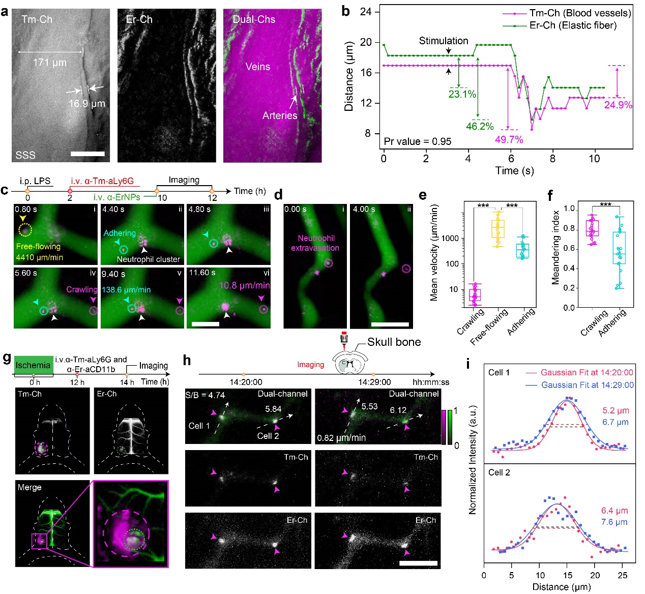 图2:(a-b) 基于新型近红外荧光探针构建的活体动态多重成像方案,实现了小鼠脑部血管舒缩运动的实时动态监测;(c-f) 基于新型近红外荧光探针构建的活体动态多重成像方案,实现了对中性粒细胞在皮下炎症部位趋化作用及外渗过程的实时动态监测和分析。(g-i) 基于新型近红外荧光探针构建的活体动态多重成像方案,实现了在脑卒中小鼠脑损伤部位激活态中性粒细胞免疫反应的实时动态成像。