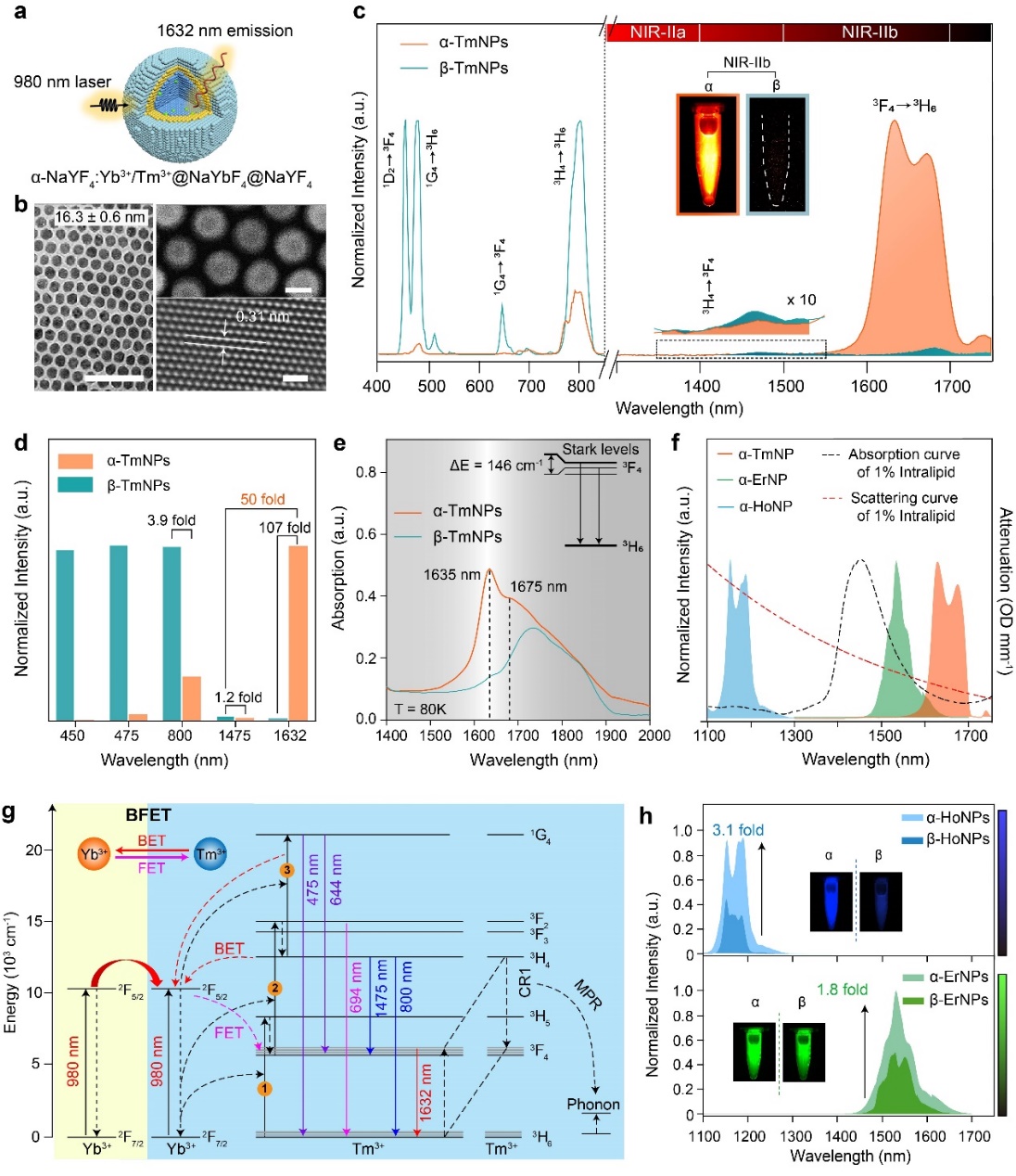 图1:(a-b) Tm3+掺杂的立方相纳米颗粒核壳结构示意图及电镜图;(c-d) Tm3+掺杂的立方相及六方晶相纳米颗粒发射光谱及不同波长处发光强度柱状图;(e) 低温吸收光谱;(f) 基于Tm3+、Er3+、Ho3+掺杂的立方相纳米颗粒发射光谱及脂肪乳剂的吸收、散射曲线;(g) Yb-Tm体系能量传递机理;(h)Er3+和Ho3+元素掺杂的立方相和六方相纳米颗粒的发射光谱及荧光成像图。