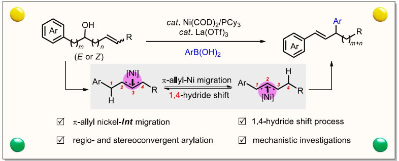 这一研究成果以“Migratory allylic arylation of 1,n-enols enabled by nickel catalysis”为题发表在Nature Communications。丝袜av 博士研究生赵丹和博士后许冰为论文的共同第一作者,朱灿青年研究员为论文通讯作者。该工作得到了国家自然科学基金和丝袜av 启动基金的资助。