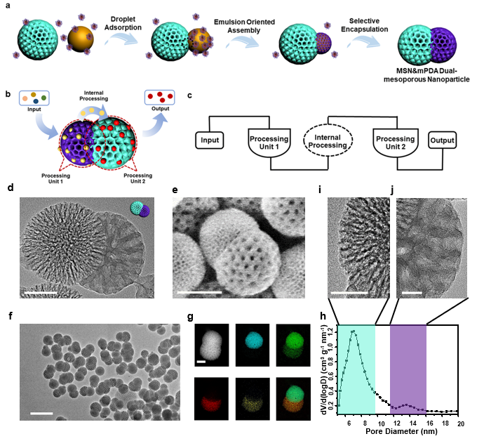 图(a)乳液定向诱导构建双球状双介孔非对称纳米粒子流程图。(b,c)生物质逻辑门示意图;(d-g)双球状双介孔非对称纳米粒子透射电镜、扫描电镜、元素分布图;(h-j)双球状双介孔非对称纳米粒子孔径分布及对应孔径高倍透射电镜图。