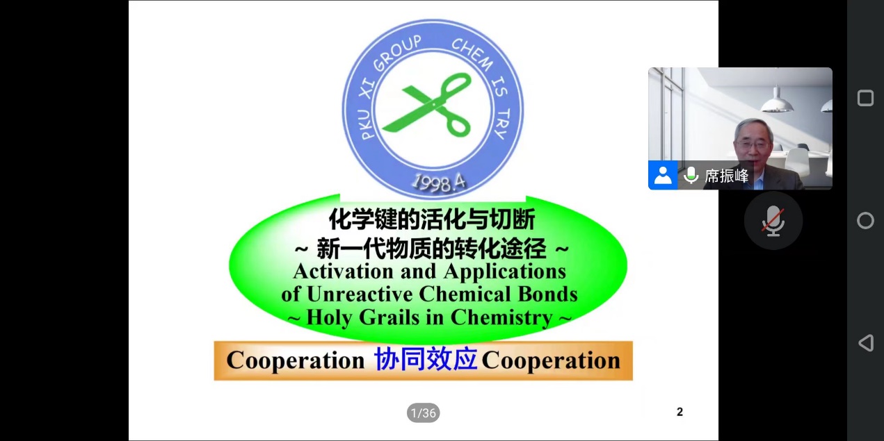 席振峰院士首先介绍了课题组的发展历史,以实验室logo的来源和具体含义为入手展开分享。接下来,席院士从研究意义、研究现状和未来挑战三个方面介绍了“直接从氮气合成含氮有机化合物”的研究。主要内容包括“工业合成氨技术及其用途”“氮气直接利用化学研究现状”“直接从氮气合成含氮有机化合物的途径”以及“从氮气构建N-C键的研究现状&未来”等。最后,席院士提出“直接从氮气合成含氮有机物”的最大挑战是“信”,旨要有坚定的信念和坚持不懈的定力。席院士的报告深入浅出,引起了线上师生的极大兴趣。报告结束后,席院士耐心解答了与会人员提出的问题。
