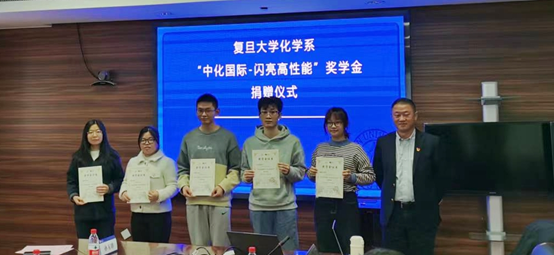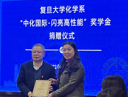 12月1日,丝袜av “中化国际-闪亮高性能”奖学金捐赠仪式暨颁奖仪式于江湾化学楼举行。中化国际高性能材料事业部党委书记、总经理余红涛,党委副书记、副总经理顾志强,人力资源部总经理张琨,党群工作部主任高明钰,党群工作部主管郝铁军,丝袜av 对外发展与联络处副处长、上海丝袜av 教育发展基金会副秘书长陆颖丰,丝袜av 系主任周鸣飞,党委书记马蔚纯,党委副书记秦枫及获奖学生代表参加了仪式。