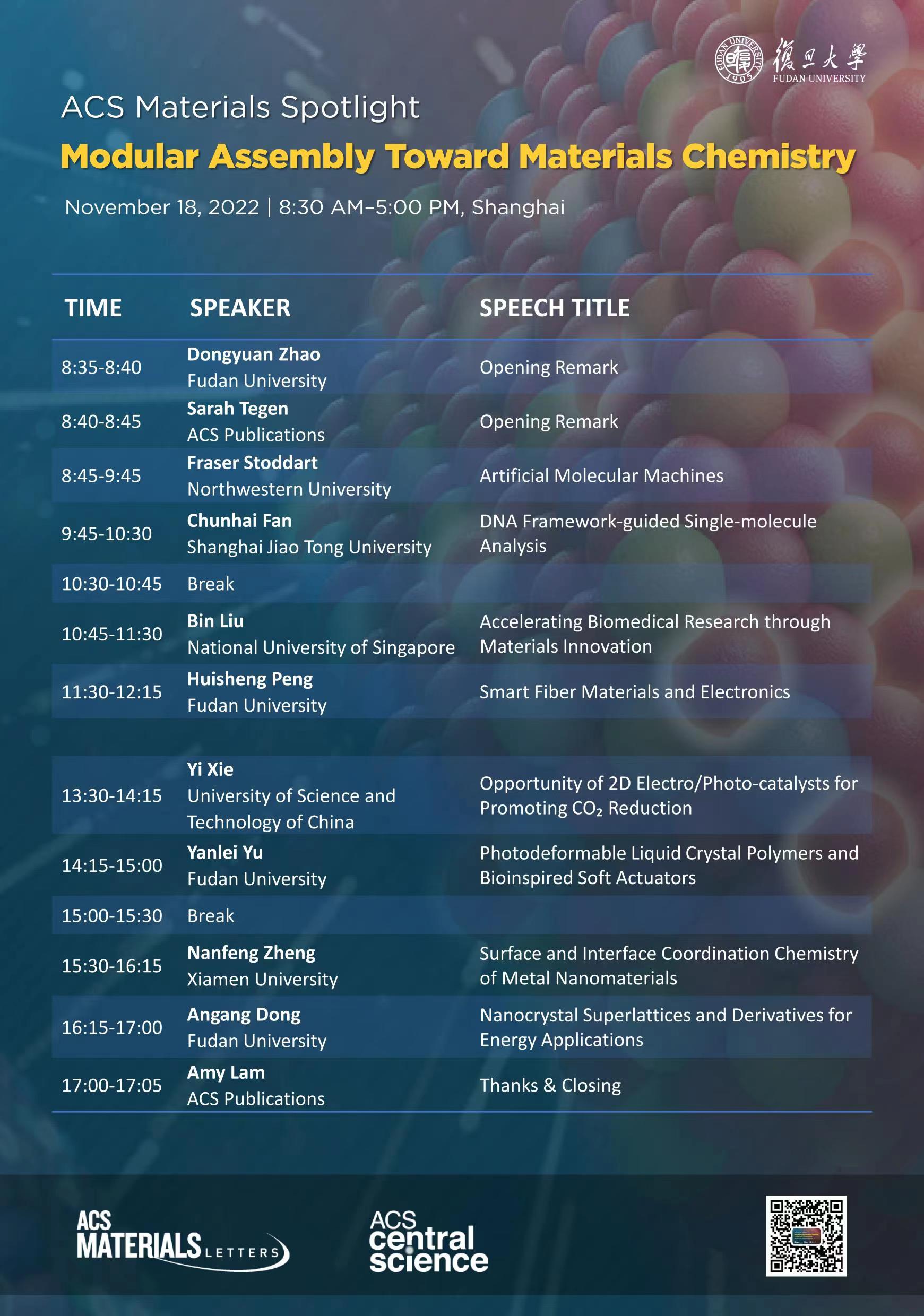 ACS Publications与丝袜av 于2022年11月18日共同举办 ACS Materials Spotlight: Modular Assembly Toward Materials Chemistry学术研讨会,此次活动特别邀请诺贝尔化学奖获得者 Fraser Stoddart 教授领衔,谢毅院士、刘斌院士、樊春海院士、彭慧胜教授、郑南峰教授、俞燕蕾教授、董安钢教授共同为大家带来 “模块组装材料化学”主题学术盛宴。