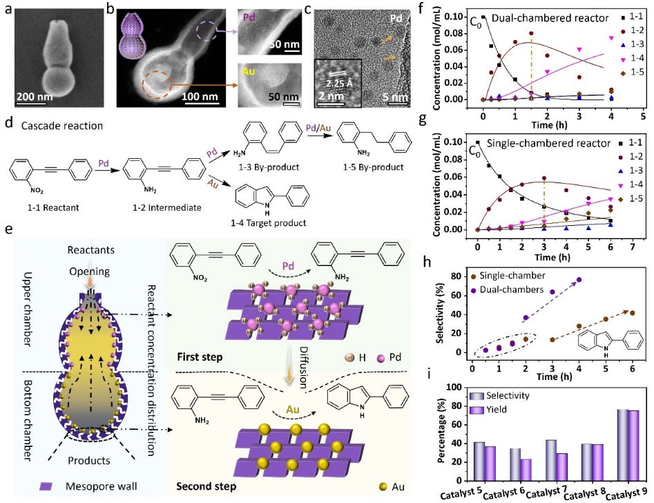 基于此,丝袜av 赵东元院士、李晓民教授团队通过一种纳米液滴的分步重塑策略合成了具有可调腔室数量(由1个到3个)和腔室分布的多腔介孔纳米颗粒。通过原位的分步共组装进一步在单颗粒水平实现了多功能(磁性、催化、光学等)实体的分离和配位构建。此外,通过在双腔开口葫芦的上腔植入Pd纳米晶,在底腔锚定Au纳米颗粒设计了具有空间分离双活性位的双腔纳米反应器。在级联反应合成2-苯基吲哚方面表现出良好的催化性能,选择性高达76.5%,是单腔室纳米反应器(约41.3%)的1.85倍。