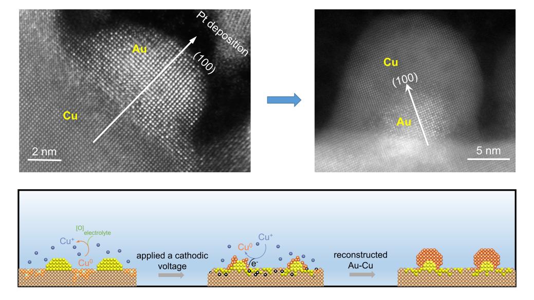 图:Au-Cu双金属在CO2R过程中结构重组高分辨TEM表征图及Cu(0)氧化还原驱动机制示意图。