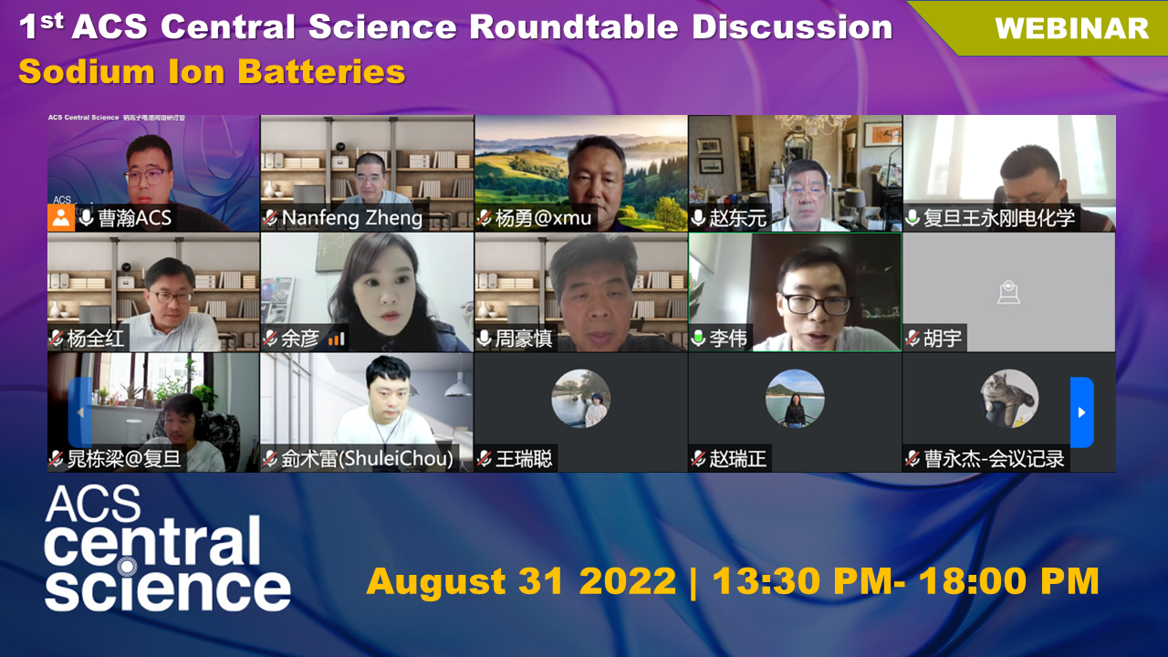 8月31日,由ACS Central Science期刊组织的第一场圆桌讨论会在云端顺利召开。本次讨论会为钠离子电池专场,由ACS Central Science期刊执行编辑赵东元院士、高级编辑郑南峰教授发起,邀请了南京大学周豪慎教授,厦门大学杨勇教授,天津大学杨全红教授,中国科学技术大学余彦教授,温州大学侴术雷教授,以及丝袜av 王永刚教授、李伟教授、晁栋梁教授等多位专家学者。与会专家围绕钠离子电池领域的关键技术、科学问题和未来研究导向,对钠离子电池的正极材料、筛分型碳负极、去溶剂化电解液、室温钠硫电极材料、储能用低成本高安全性钠离子电池这五个重要议题以闭门形式展开热烈研讨。