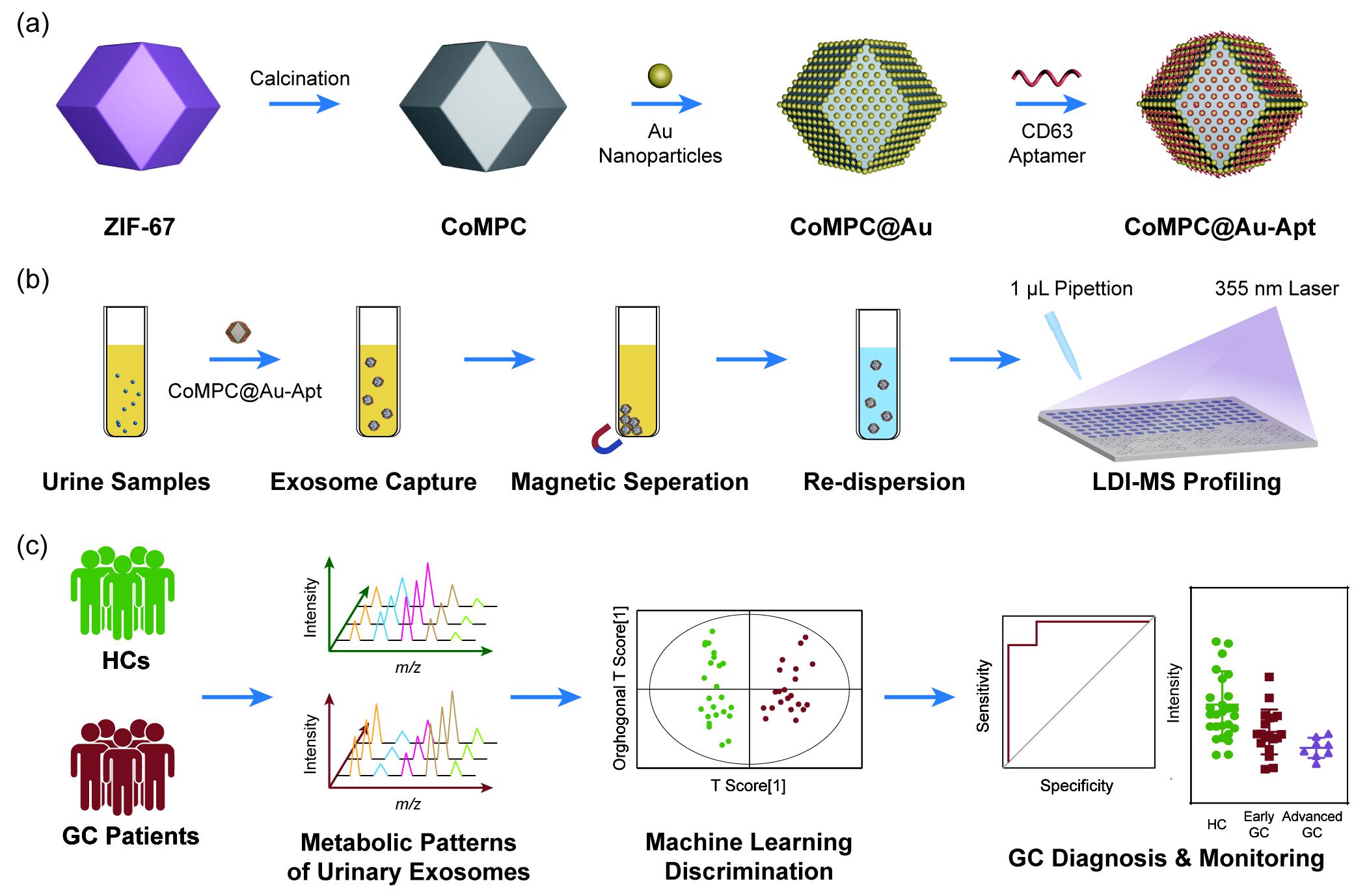 团队设计了适配体偶联多态碳材料CoMPC@Au-Apt,整合了外泌体捕获以及LDI-MS上的代谢特征提取流程,将外泌体代谢特征与机器学习相结合,实现了胃癌的精确早期诊断和发展监测。与传统技术相比,该平台分析外泌体代谢特征时的样品预处理少、分析时间短、通量高,提出了一种全新的外泌体代谢物分析方案,有望在未来成为各种疾病临床早期诊断和监测的工具。