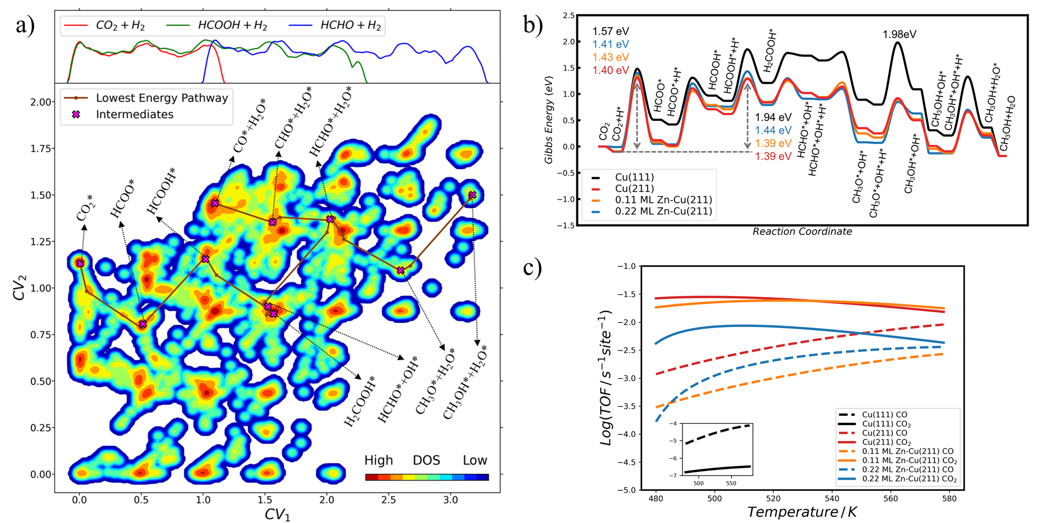 Cu/ZnO/Al2O3催化甲醇合成是一个已经工业化近60年的重要传统工业过程,一般采用CO和CO2混合进气在高温高压下与H2反应。由于实验上高分辨表征手段一般只能在超高真空或较低的压强下进行,难以达到工业反应条件,关于在工业催化条件下,Zn物种在催化剂的活性状态以及CO2在甲醇合成中的作用,一直有很大争议。对于这类工况条件下异常复杂的催化问题的求解,既需要对材料热力学的深刻理解,同时也需要对复杂多步反应网络的反应动力学的精准数据。