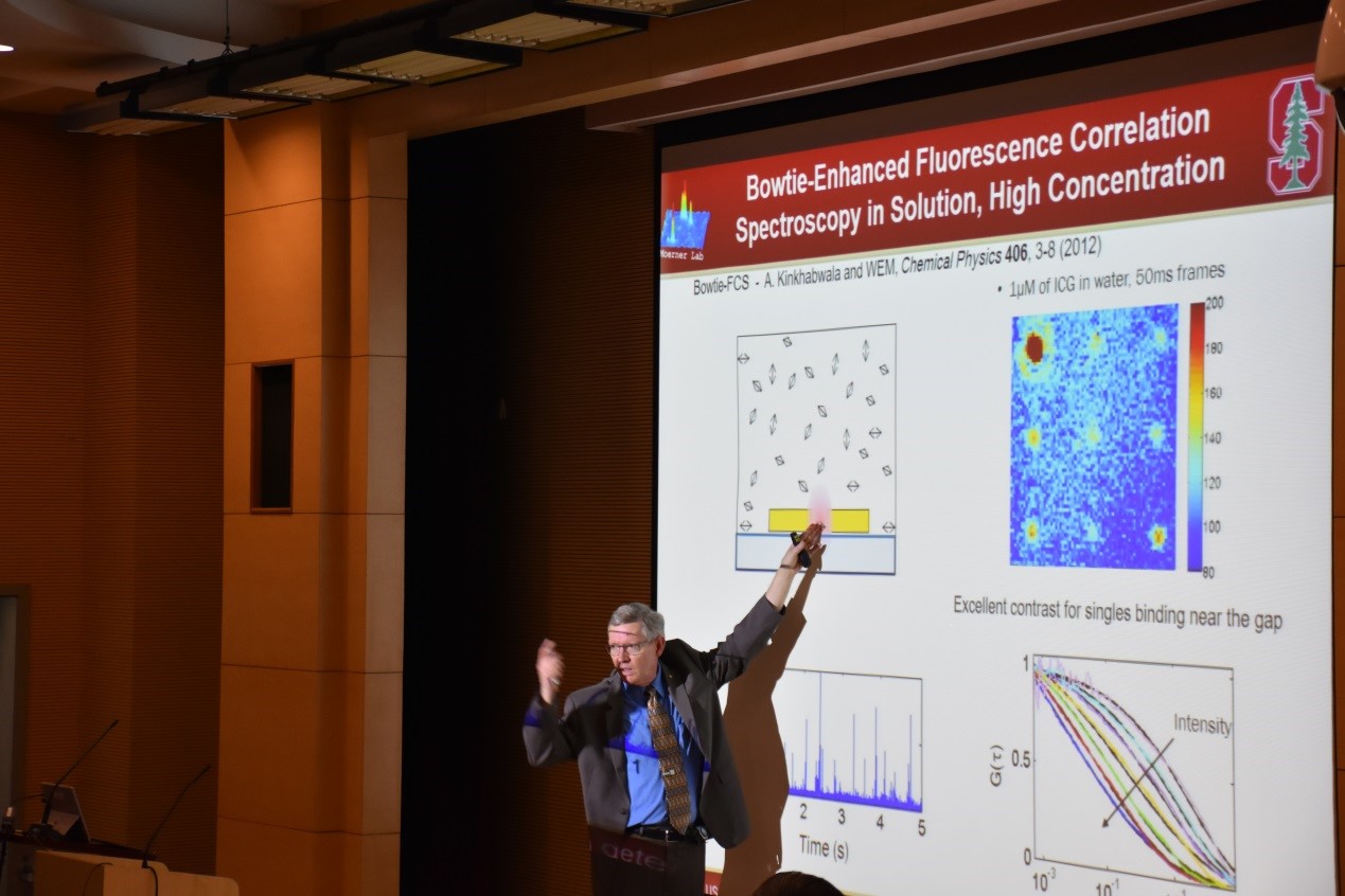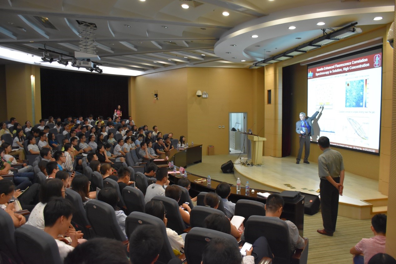 在报告中,Moerner教授首先跟大家介绍了单分子29年来的发展历程,接着向与会师生介绍了单分子作为光学纳米探针在超分辨显微镜、结合PSF工程进行3D超分辨成像和示踪以及在单生物分子动力学等方面精彩的研究情况。Moerner教授的精彩报告给大家带来了很大的启发,激起了与会师生的极大兴趣。Moerner教授给广大师生传达的理念是做科学研究要勇于突破思维限制,利用自己所学来解决实际问题,鼓励同学们不要迷信权威,要勇于开拓未知的学术领域。