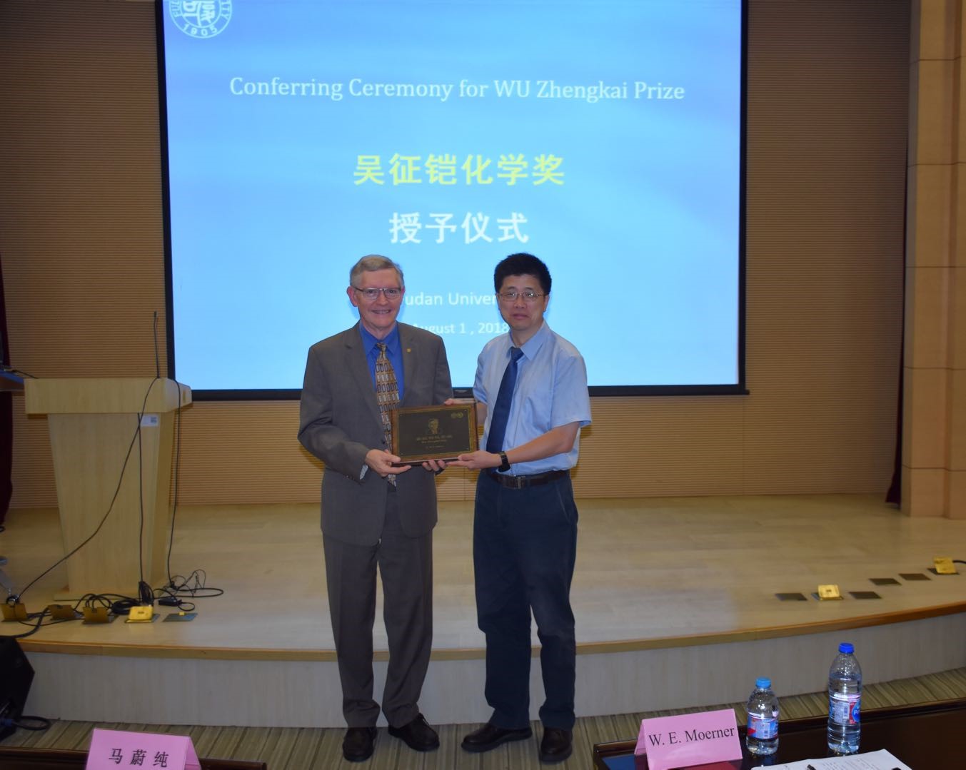 杨芃原教授主持。杨芃原教授向与会师生详细的介绍了Moerner教授的学术经历、研究方向和成果。开讲之前,校长助理徐雷上台授予Moerner教授荣誉教授证书,并代表“吴征铠化学奖”组委会向Moerner教授颁发了丝袜av