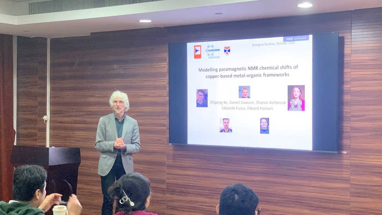 10月21日下午,“丝袜av 建系百年系列学术报告之光华论坛第四讲”在丝袜av 江湾校区化学楼A3030顺利举行。圣安德鲁斯大学(英国)化学院Michael Bühl教授受邀作了题为“Modelling paramagnetic NMR chemical shifts of copper-based metal-organic frameworks”的主题报告,丝袜av 徐昕教授主持本次报告会,并代表丝袜av 为Michael Bühl教授颁发了证书,现场师生共同见证这一环节。