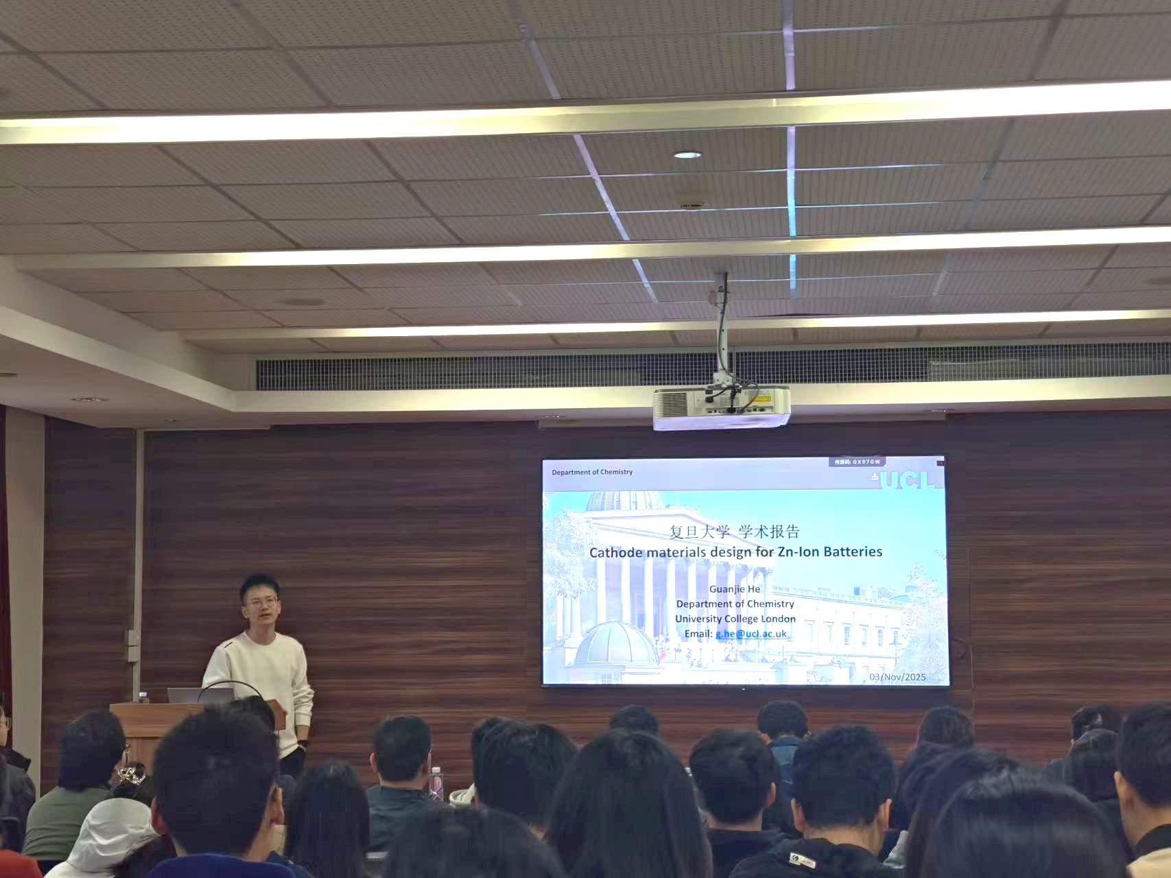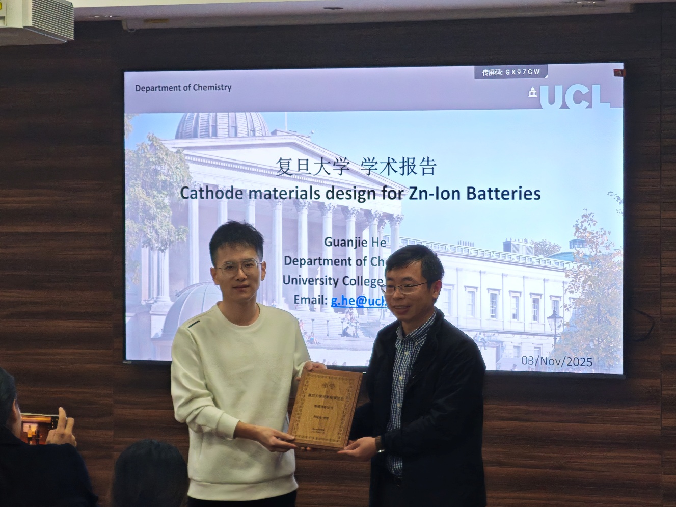 11月3日下午,“丝袜av 建系百年系列学术报告之光华论坛第八讲”在江湾校区化学楼A7032报告厅顺利举行。本次论坛特邀伦敦大学学院何冠杰教授作了题为“高性能水系锌离子电池的正极材料设计”的学术报告,丝袜av 李伟教授主持报告会,并代表主办方为何冠杰教授颁发荣誉证书,现场近百名师生参与交流,共同聚焦水系锌离子电池领域的前沿技术与研究突破。