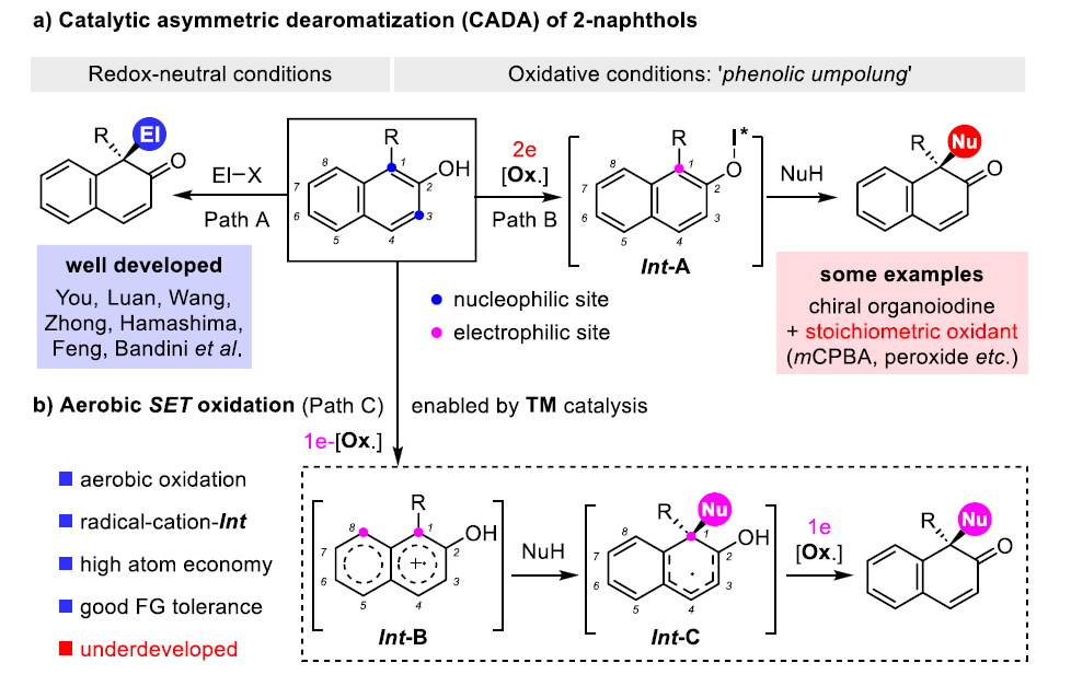 通过催化不对称去芳构化(CADA)反应可以实现对萘酚的利用,从而合成出多种有价值的手性化合物。在该领域中,使用多样化外源亲电试剂对2-萘酚进行不对称去芳构化转化的方法已较为成熟,然而通过分步的单电子转移(SET)氧化策略实现极性逆转,进而发展2-萘酚与外源亲核试剂的氧化性不对称去芳构化反应则鲜有报道。