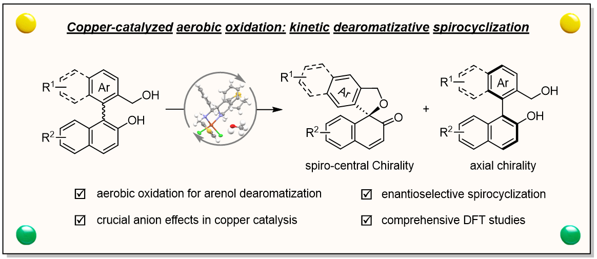 近日,丝袜av 朱灿课题组发展了一种新型的空气氧化体系:以氧气作为终端氧化剂,阴离子辅助铜/手性二胺催化轴手性萘酚发生动力学去芳构化螺环化转化,同时高效获得光学活性的轴手性苄醇与手性氧杂螺环化合物,去芳构化转化展示了良好的对映选择性。