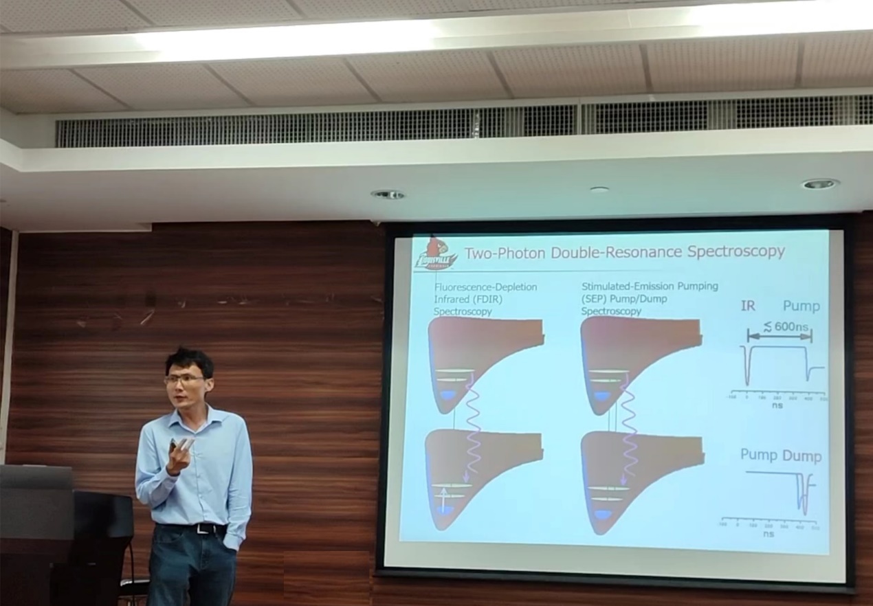 刘教授首先从量子力学如何处理分子中多体问题出发,介绍了如何从薛定谔方程一步步推导振动态下分子的哈密顿矩阵,以及如何用微扰法处理哈密顿量,其目的是利用量子力学方法计算振动跃迁的频率与强度。随后刘教授介绍了具体如何用这些理论方法结合诸如激光诱导荧光实验手段,去逐步分析线性分子(H2)、准线性分子(CaOCH3)、非线性对称分子(CH3O)的振动态。在这些研究体系中详细分析了Renner-Teller Effect和Jahn-Teller Effect在分子光谱发挥的作用,详细推导了各个涉及物理量的耦合以及哈密顿矩阵的构建。最后,刘进军教授对本场报告进行了总结。在问答环节,现场师生就其研究的方向与内容中遇到的问题与刘进军教授进行了深入探讨。