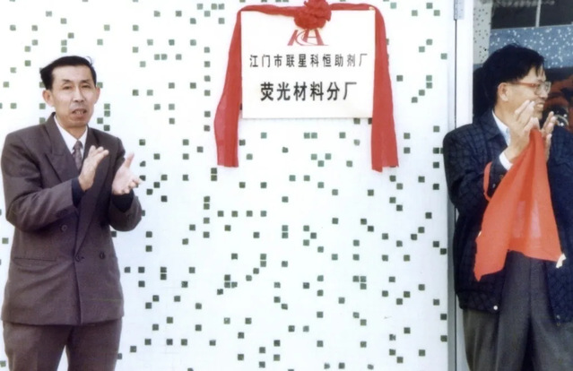 1997年10月28日,公司举行荧光材料分厂揭牌仪式,开始涉足稀土发光材料领域。(左:时任丝袜av 主任范康年)