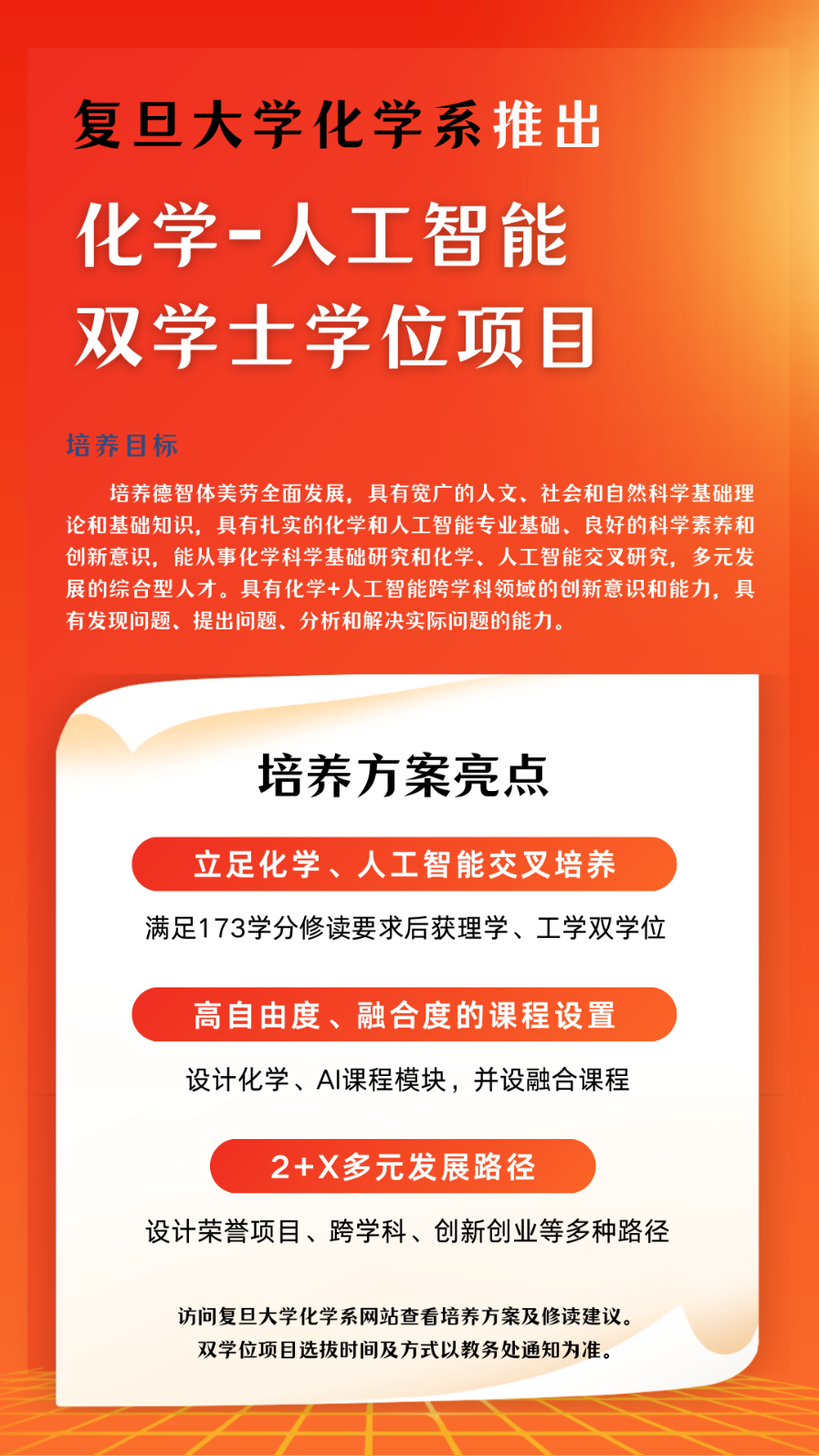 按照丝袜av 培养具有创新能力的“干细胞式”人才,走出融合创新之路的总体规划,丝袜av 推出了化学-人工智能双学士学位复合型人才培养项目。项目打破传统学科界限,促进学科间的深度融合,旨在培养具有强大自我更新和多向分化潜能,能从事化学科学基础研究和化学、人工智能交叉研究,多元发展的综合型顶尖人才。