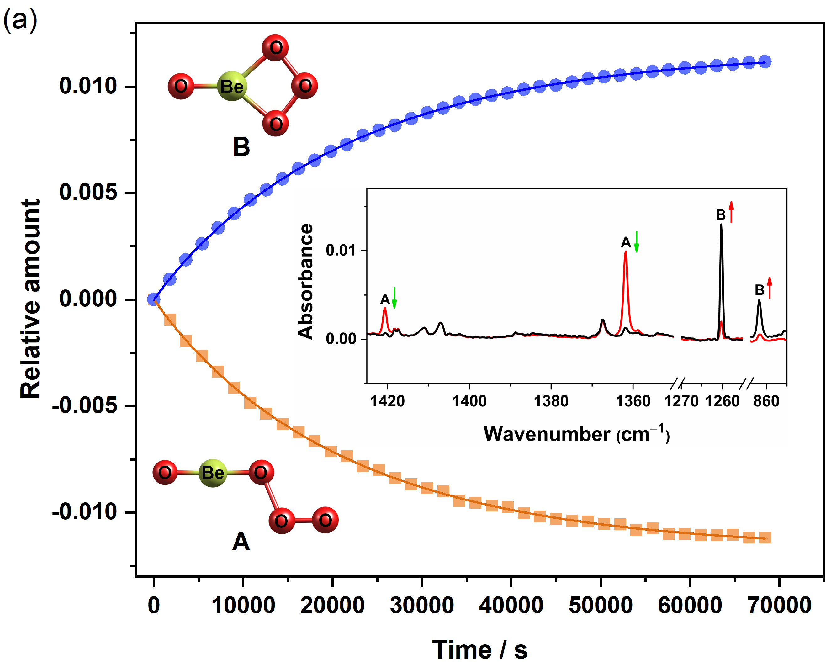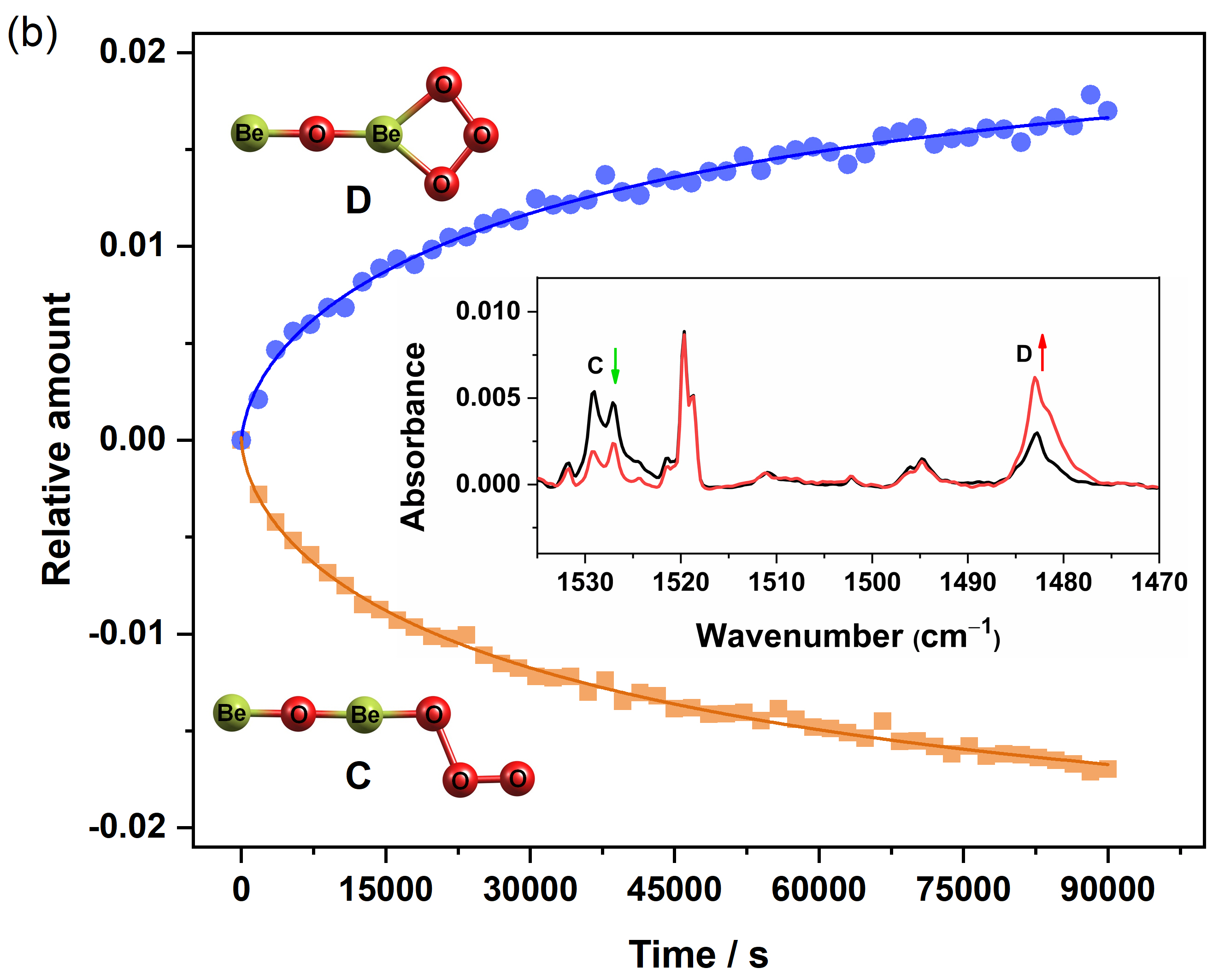 图2. 在3 K Ne基质中异构化反应OBeOOO (A)®OBe(h2-O3) (B)和BeOBeOOO (C)®BeOBe(h2-O3) (D)的动力学曲线。