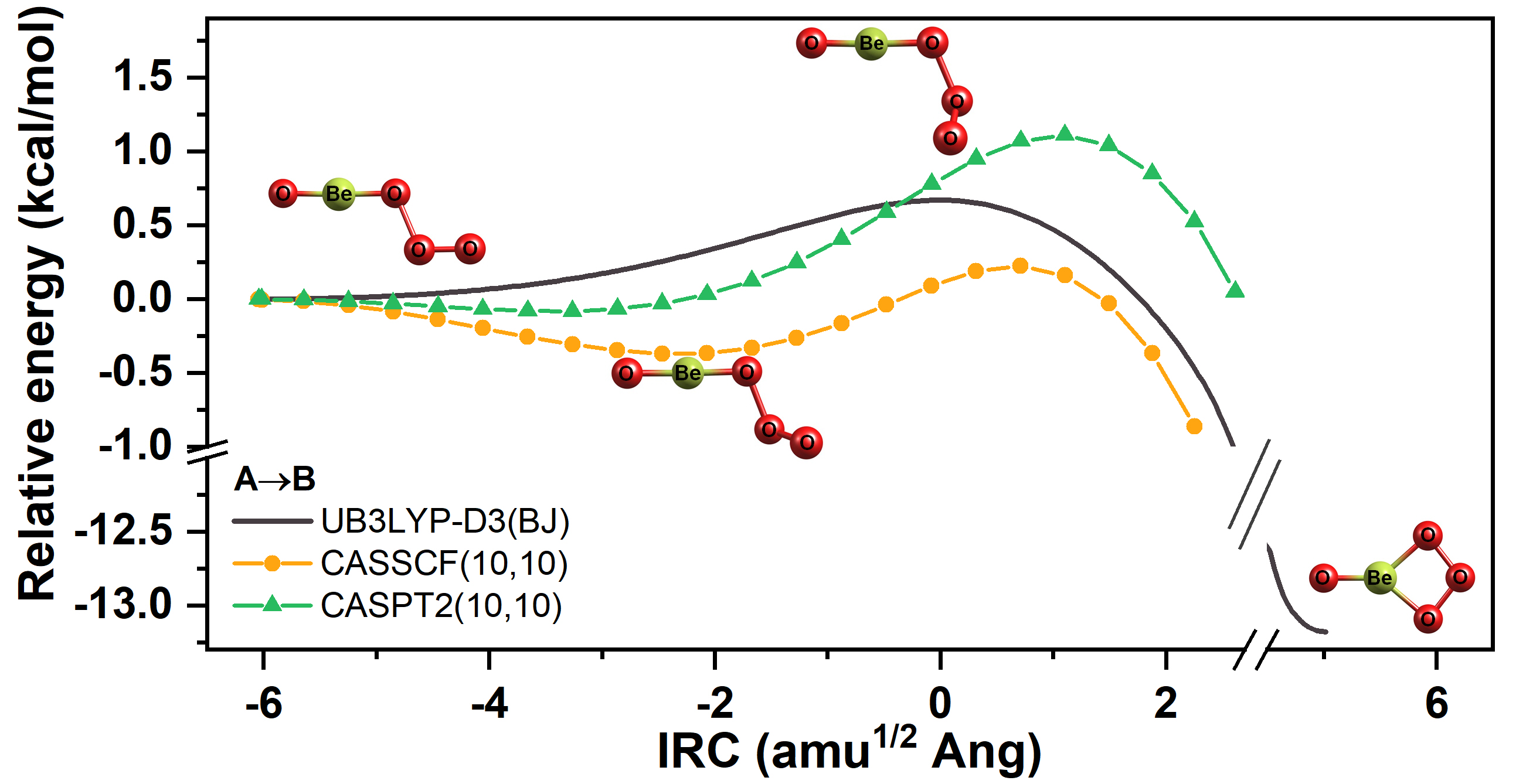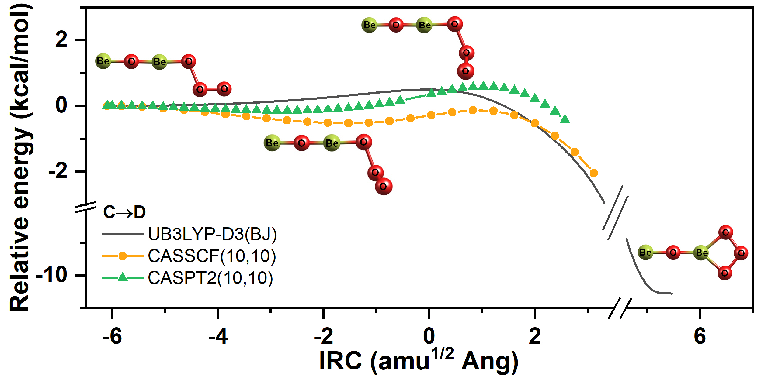 图3. 在不同多参考态水平下对B3LYP-D3(BJ)优化的OBeOOO (A)®OBe(h2-O3) (B)和BeOBeOOO (C)®BeOBe(h2-O3) (D)反应路径进行能量计算。