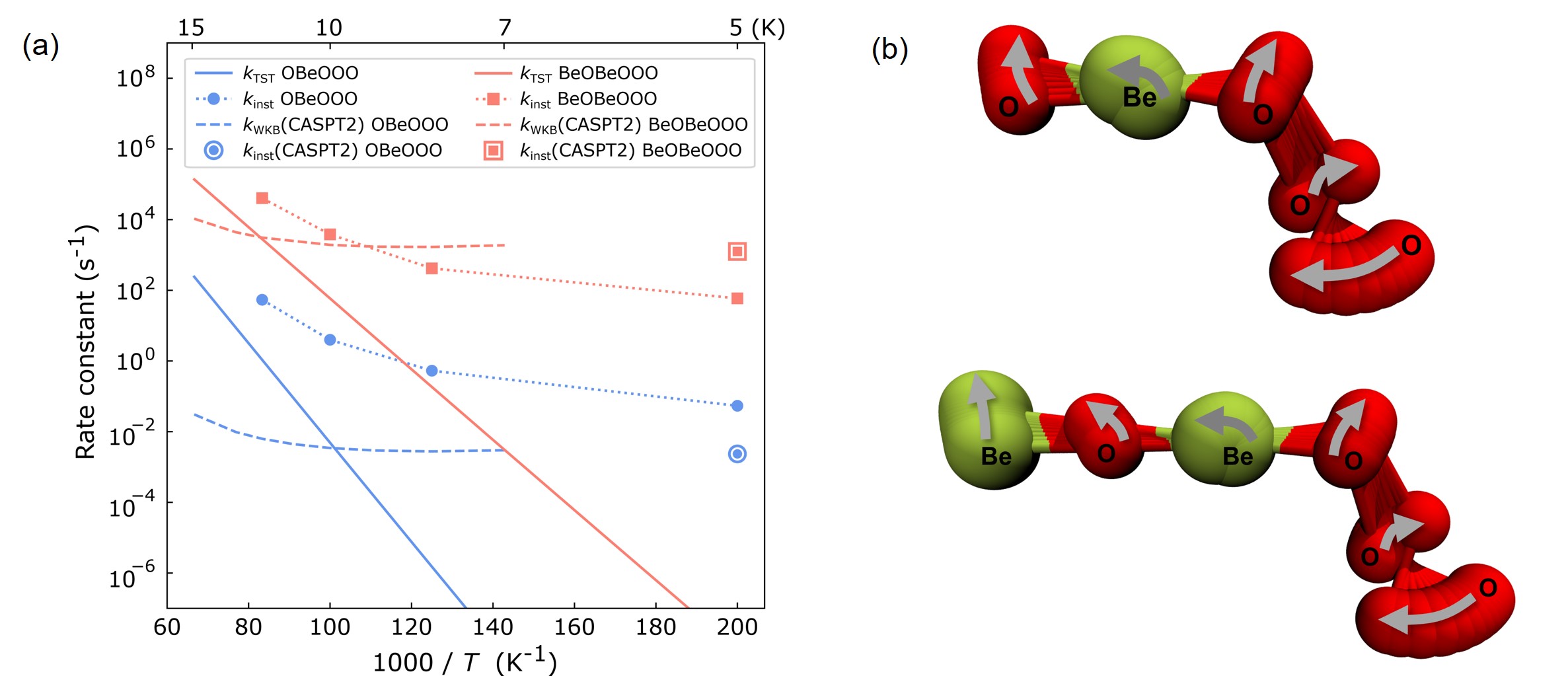 图4. (a) 理论计算得到的两组异构化反应的速率常数;(b) OBeOOO(A)和BeOBeOOO(C)在5 K下的瞬子路径。