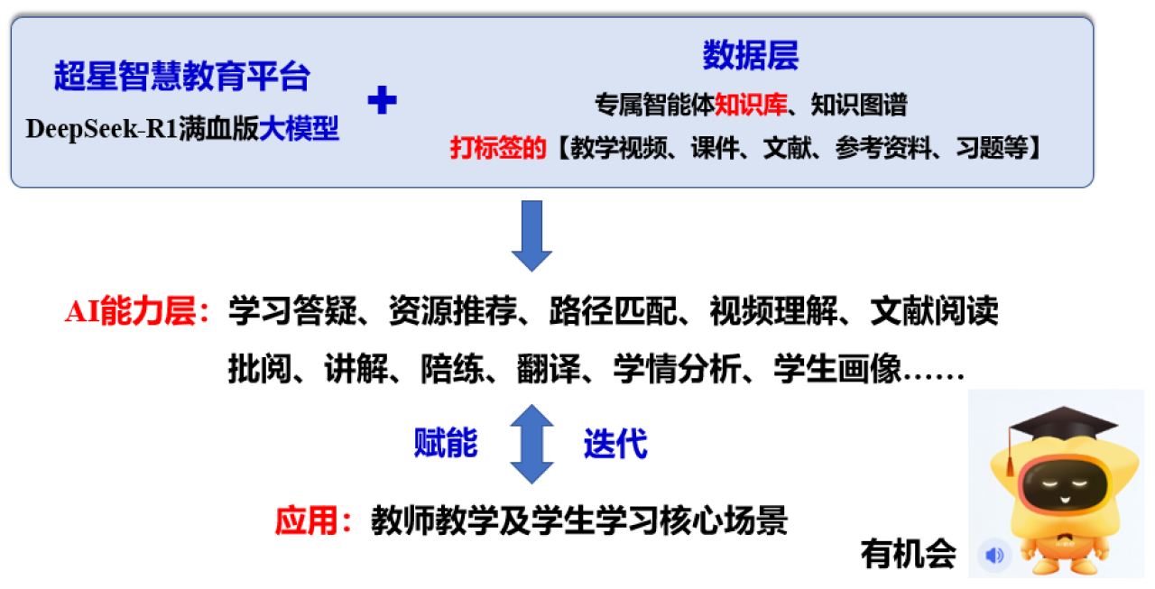 课程依托超星平台和DeepSeek大模型,构建了含576个文件、超6.3万个知识切片的专属知识库,梳理413个知识点形成系统化知识图谱。AI助教“有机会”提供24小时个性化学习支持,实时学习数据助力教师精准把握学情、调整教学节奏。本课程已在“学银在线”平台上线,所形成的教学案例在丝袜av 人工智能教育教学创新中心平台-驾驭AI板块展示,已在线发表教学论文一篇,在多个全国性教学会议上做分会报告,相关成果有望进一步辐射兄弟院校。