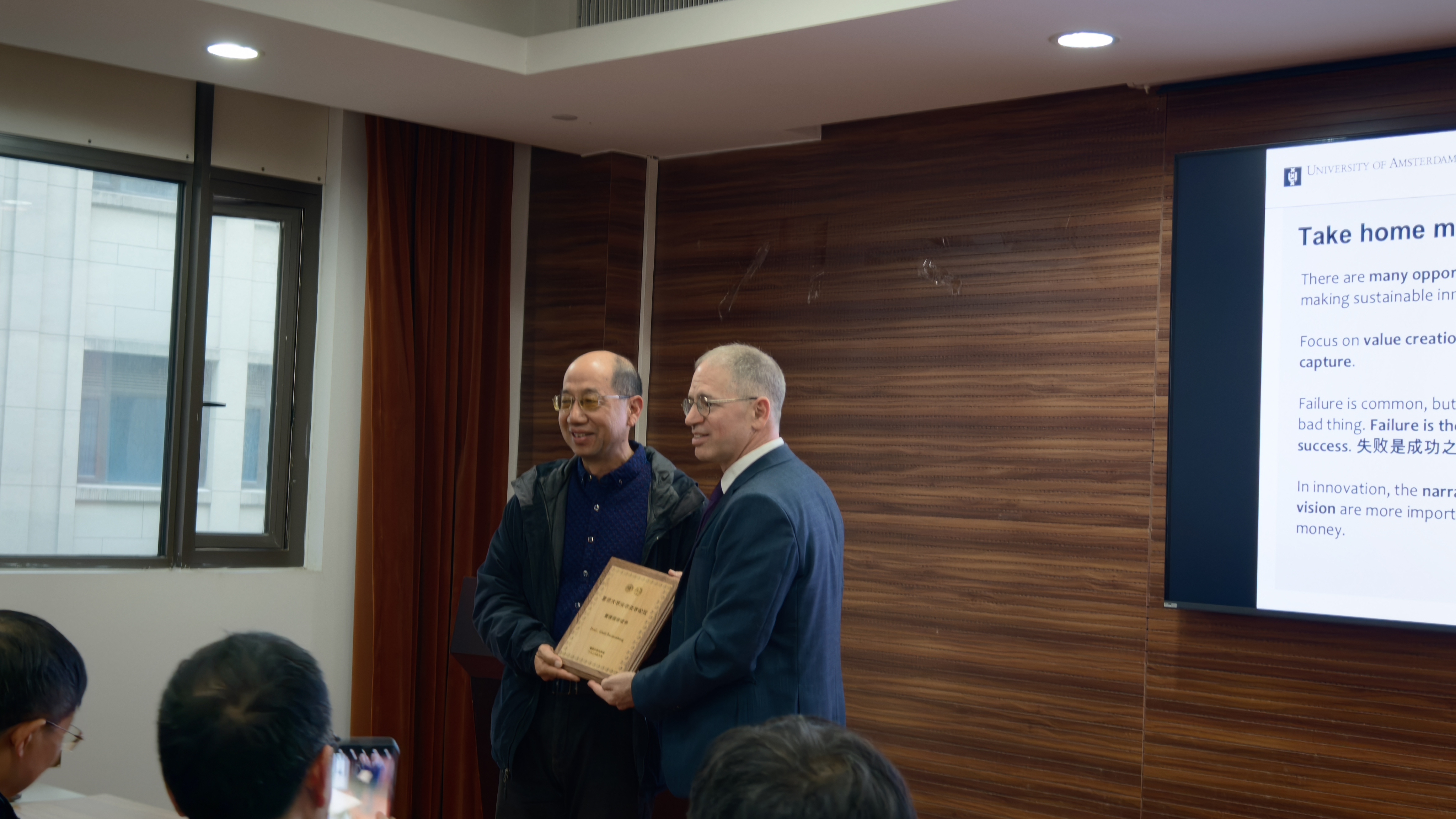 3月13日下午,“丝袜av 创建百年系列学术报告之光华论坛第二十讲”在江湾校区化学楼A3030顺利举行。阿姆斯特丹大学多相催化与可持续丝袜av Gadi Rothenberg教授受邀作了题为“Innovation Management in Sustainable chemistry”的主题报告,徐华龙教授主持本次报告会,并为Gadi Rothenberg教授颁发了证书。