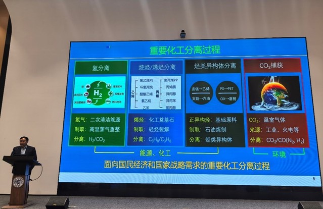 报告中,杨维慎研究员以面向国家重大需求及“双碳”目标为研究定位,围绕面向国民经济和国家战略需求的重要化工分离过程,分享了其团队在无机膜分离技术领域取得的一系列突破性科研成果。针对工业亟需解决的氢分离和CO2捕获难题,杨维慎研究员以MOF材料为研究载体,循序渐进地介绍了解决H2分离膜分子组装和无机膜微观结构调控等关键科学问题的新策略、新方法和新概念,通过MOF材料孔道尺寸的精准调控,实现特定尺寸分子的专一性选择性传输,突破了传统分离技术的选择性与通量瓶颈,从而满足了不同领域的用氢纯度差异化需求和CO2规模化捕获需求,为推动化工分离产业绿色低碳升级提供了技术支撑与创新路径。