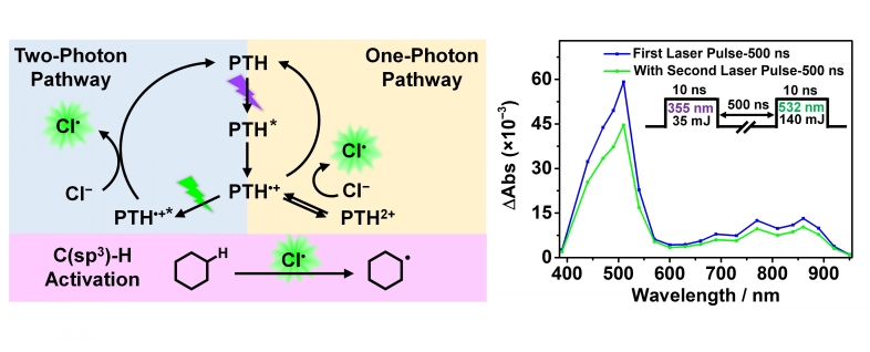Chloride oxidation has tremendous utility in the burgeoning field of chlorine-mediated C–H activation, yet it remains a challenging process to initiate with light because of the exceedingly positive one-electron reduction potential, E° (Cl•/–), beyond most common transition-metal photooxidants. Herein, two photocatalytic chloride oxidation pathways that involve either one- or consecutive two-photon excitation of N-phenylphenothiazine (PTH) are presented. The one-photon pathway generates PTH•+ by oxidative quenching that subsequently disproportionates to yield PTH2+ that oxidizes chloride; this pathway is also accessed by the electrochemical oxidation of PTH. The two-photon pathway, which proceeded through the radical cation excited state, 2PTH•+*, was of particular interest as this super-photooxidant was capable of directly oxidizing chloride to chlorine atoms. Laser flash photolysis revealed that the photooxidation by the doublet excited state proceeded on a subnanosecond timescale through a static quenching mechanism with an ion-pairing equilibrium constant of 0.36 M–1. The PTH photoredox chemistry was quantified spectroscopically on nanosecond and longer time scales, and chloride oxidation chemistry was revealed by reactivity studies with model organic substrates. One- and two-photon excitation of PTH enabled chlorination of unactivated C(sp3)–H bonds of organic compounds such as cyclohexane with substantial yield enhancement observed from inclusion of the second excitation wavelength. This study provides new mechanistic insights into chloride oxidation catalyzed by an inexpensive and commercially available organic photooxidant.