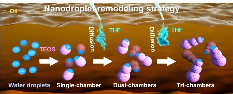 Multi-chambered architectures have attracted much attention due to the ability to establish multifunctional partitions in different chambers, but manipulating the chamber numbers and coupling multi-functionality within the multi-chambered mesoporous nanoparticle remains a challenge. Herein, we propose a nanodroplet remodeling strategy for the synthesis of hierarchical multi-chambered mesoporous silica nanoparticles with tunable architectures. Typically, the dual-chambered nanoparticles with a high surface area of ~469 m2 g−1 present two interconnected cavities like a calabash. Furthermore, based on this nanodroplet remodeling strategy, multiple species (magnetic, catalytic, optic, etc.) can be separately anchored in different chamber without obvious mutual-crosstalk. We design a dual-chambered mesoporous nanoreactors with spatial isolation of Au and Pd active-sites for the cascade synthesis of 2-phenylindole from 1-nitro-2-(phenylethynyl)benzene. Due to the efficient mass transfer of reactants and intermediates in the dual-chambered structure, the selectivity of the target product reaches to ~76.5%, far exceeding that of single-chambered nanoreactors (~41.3%).
