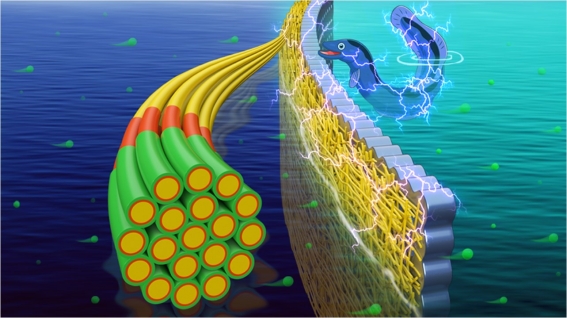The capture of sustainable energy from a salinity gradient, in particular, using renewable biomass-derived functional materials, has attracted significant attention. In order to convert osmotic energy to electricity, many membrane materials with nanofluidic channels have been developed. However, the high cost, complex preparation process, and low output power density still restrict the practical application of traditional membranes. Herein, we report the synthesis of highly flexible and mechanically robust nanofiber-arrays-based carbonaceous ordered mesoporous nanowires (CMWs) through a simple and straightforward soft-templating hydrothermal carbonization approach. This sequential superassembly strategy shows a high yield and great versatility in controlling the dimensions of CMWs with the aspect ratio changes from about 3 to 39. Furthermore, these CMWs can be used as novel building blocks to construct functional hybrid membranes on macroporous alumina. This nanofluidic membrane with asymmetric geometry and charge polarity exhibits low resistance and highperformance energy conversion. This work opens a solution-based route for the one-pot preparation of CMWs and functional heterostructure membranes for various applications.