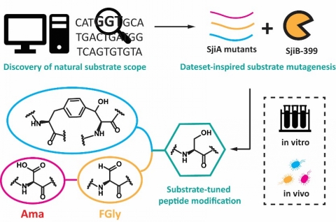 Aminomalonate (Ama) is a widespread structural motif in Nature, whereas its biosynthetic route is only partially understood. In this study, we show that a radical S-adenosylmethionine (rSAM) enzyme involved in cyclophane biosynthesis exhibits remarkable catalytic promiscuity. This enzyme, named three-residue cyclophane forming enzyme (3-CyFE), mainly produces cyclophane in vivo, whereas it produces formylglycine (FGly) as a major product and barely produce cyclophane in vitro. Importantly, the enzyme can further oxidize FGly to produce Ama. Bioinformatic study revealed that 3-CyFEs have evolved from a common ancestor with anaerobic sulfatase maturases (anSMEs), and possess a similar set of catalytic residues with anSMEs. Remarkably, the enzyme does not need leader peptide for activity and is fully active on a truncated peptide containing only 5 amino acids of the core sequence. Our work discloses the first ribosomal path towards Ama formation, providing a possible hint for the rich occurrence of Ama in Nature.