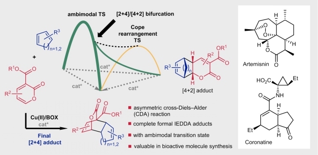 Compared with the conventional Diels–Alder reaction, the development of selective cross-Diels–Alder reactions between two different conjugated dienes, especially in a catalytic asymmetric manner, has been neglected. We now report a peri- and enantioselective cross-Diels–Alder reaction of 3-alkoxycarbonyl-2-pyrones with unactivated conjugated dienes catalysed by a copper(II)–bis(oxazoline) complex, leading to formal inverse-electron-demand adducts with high enantioselectivity under mild reaction conditions. Computational studies showed that this reaction proceeds through an ambimodal transition state: post-transition-state bifurcation leads to [2+4] and [4+2] adducts with the same enantioselectivity, followed by a facile Cope rearrangement to provide a single observed thermodynamic [2+4] product. This reaction occurs with a wide variety of cyclopentadienes, fulvenes and cyclohexadienes, providing a highly efficient and enantioselective approach to densely functionalized cis-bicyclic scaffolds. The synthetic value of this reaction is demonstrated by the asymmetric synthesis of two biologically important natural products, artemisinic acid and coronafacic acid.