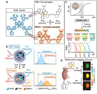 Fig 1. (a) Chemical Structure of NIR-II FRET donor and acceptor. (b)  pH response illustration of pTAS. Channel 1–2 represent for the signal collection regions during ratiometric fluorescence imaging. c) Illustration of of pHt regulation in pTAS. d) Illustration of the in vivo dynamic pH monitor at tumor by ratiometric fluorescence imaging.