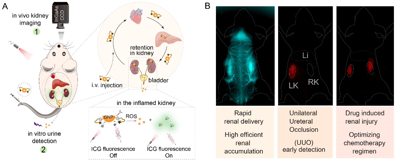 Kidney disease is usually “silent” at the early stage but can lead to severe kidney failure later on. The development of bioimaging probes with rapid distribution and long-term retention in the kidney is significant for the precise diagnosis of renal diseases. Here, a strategy for the peptide-mediated delivery and long-term accumulation (>48 h) of second near-infrared window (NIR-II) fluorophores into the kidney is demonstrated. It is shown that both the hepatic-cleared organic molecules and fast renal-cleared ultrasmall nanoparticles can be retained in the kidney after conjugation to the peptide with high polarity. Moreover, a ROS-responsive activatable bilateral NIR-II sensor was designed based on the kidney targeting peptide, which enables both in vivo long-term kidney monitoring and in vitro urine analysis. The capability of the peptide-based sensor to detect early kidney injury and report on kidney dysfunctional progression is particularly crucial for chemotherapy regimen optimization and timely renoprotective intervention during medication.