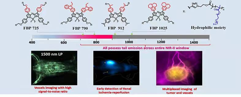 Early detection of kidney disease is of vital importance due to its current prevalence worldwide. Fluorescence imaging, especially in the second near-infrared window (NIR-II) has been regarded as a promising technique for the early diagnosis of kidney disease due to the superior resolution and sensitivity. However, the reported NIR-II organic renal-clearable probes are hampered by their low brightness (ϵmaxΦf>1000 nm<10 M−1 cm−1) and limited blood circulation time (t1/2<2 h), which impede the targeted imaging performance. Herein, we develop the aza-boron-dipyrromethene (aza-BODIPY) brush macromolecular probes (Fudan BDIPY Probes (FBP 912)) with high brightness (ϵmaxΦf>1000 nm≈60 M−1 cm−1), which is about 10-fold higher than that of previously reported NIR-II renal-clearable organic probes. FBP 912 exhibits an average diameter of ≈4 nm and high renal clearance efficiency (≈65 % excretion through the kidney within 12 h), showing superior performance for non-invasively diagnosis of renal ischemia-reperfusion injury (RIR) earlier than clinical serum-based protocols. Additionally, the high molecular weight polymer brush enables FBP 912 with prolonged circulation time (t1/2≈6.1 h) and higher brightness than traditional PEGylated renal-clearable control fluorophores (t1/2<2 h), facilitating for 4T1 tumor passive targeted imaging and renal cell carcinoma active targeted imaging with higher signal-to-noise ratio and extended retention time.