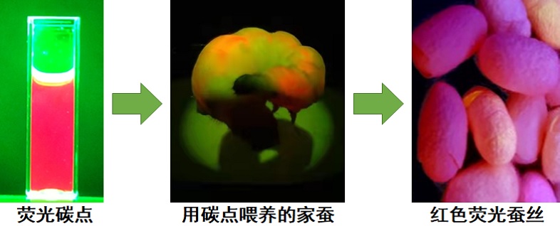 Fluorescent silk has promising applications in dazzling textiles, biological engineering, and medical products, but the natural Bombyx mori silk has almost no fluorescence. Here carbon dots (CDs) made from mulberry leaves are reported, which have a strong near-infrared fluorescence with absolute quantum yield of 73% and a full width at half maximum of 20 nm. After feeding with such CDs, silkworms exhibit bright red fluorescence, grow healthily, cocoon normally, and turn to moths finally. The cocoons are pink in daylight and show bright red fluorescence under ultraviolet light. After breaking out of such cocoons, the red-emissive moths can mate and lay fluorescent eggs which would hatch normally. The growth cycle of the second generation of the test silkworm is the same as that of the control group, which means such CDs have excellent biocompatiblility. Dissection and analyses on both the test silkworms and cocoons disclose the metabolic route of the CDs, that is, the fluorescent CDs are absorbed by silkworms from ali mentary canals, then transferred to silk glands, and finally to cocoons, while those unabsorbed CDs are excreted with the feces. All experimental results confirm the excellent biocompatibility and fluorescence stability of such CDs.